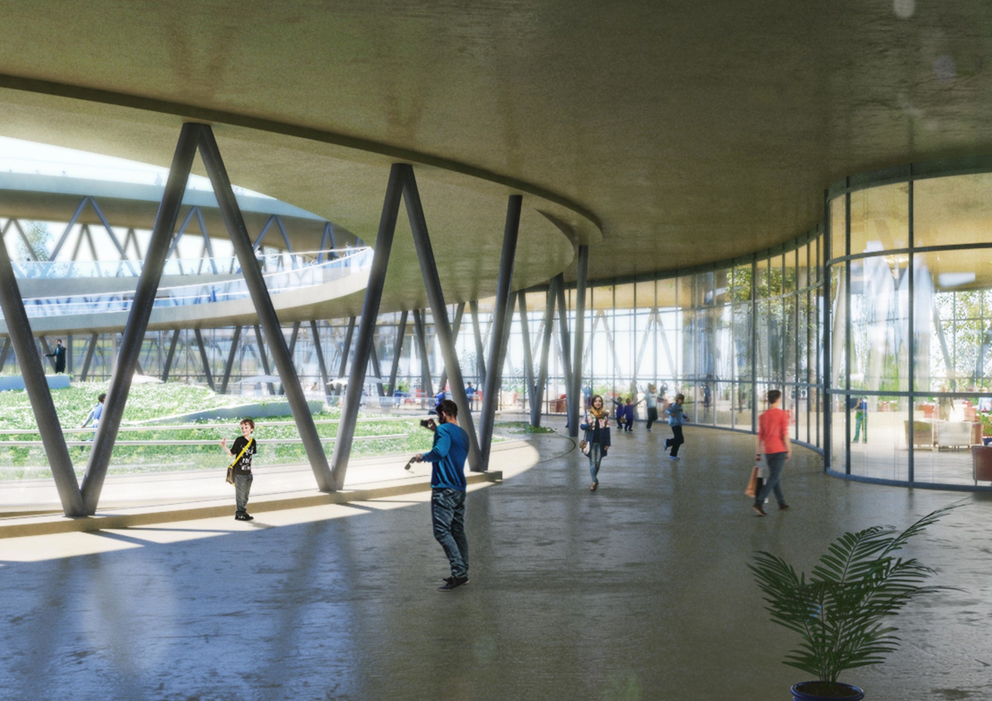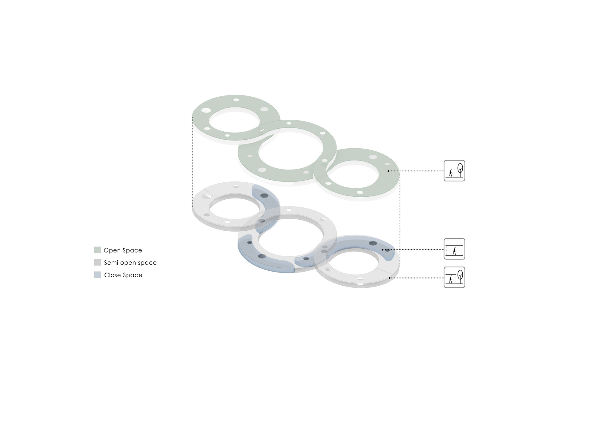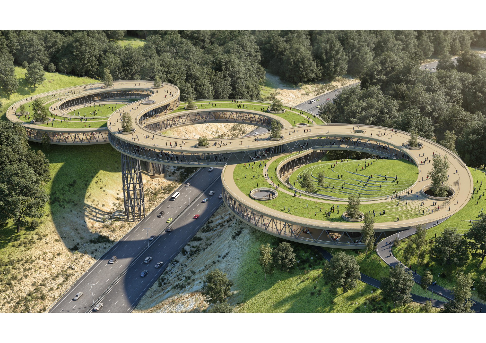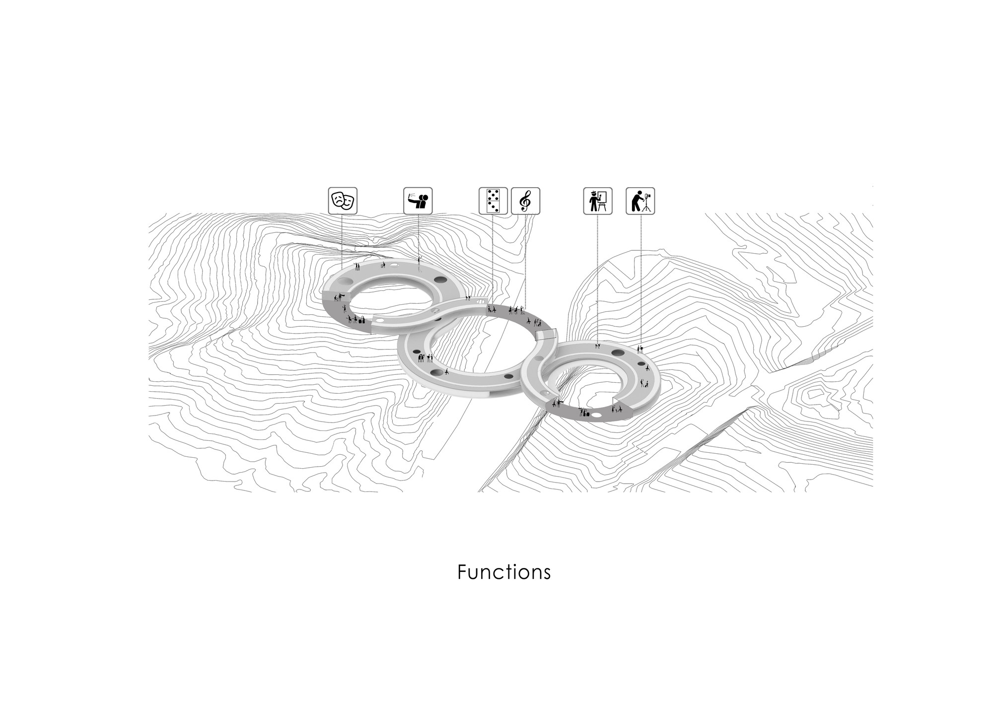 The El Goli Bridge addresses the challenge of creating an urban space in Tabriz that accommodates diverse activities across all seasons and weather conditions. The design integrates urban behaviors, functioning independently while fostering social and environmental interactions. The bridge serves as a multi-functional urban platform connecting two major tourist attractions in Tabriz. It is designed to support various activities, including: • Rest and relaxation • Movement and sports • Social interactions • Engagement with nature The design creates three interconnected layers, geometrically defined as interwoven loops that provide optimal views of the surrounding environment. The bridge offers three distinct spatial qualities: open, semi-enclosed, and enclosed—across its levels, supporting a variety of activities: 1. Open Levels: • Dedicated to activities like cycling, running, and outdoor sports. 2. Semi-Enclosed Levels: • Designed for social activities, walking, and sitting in open-air spaces, integrated with green areas at each segment. 3. Enclosed Levels: • Accommodates restaurants, cafés, and galleries with semi-open spaces, offering seating areas and social engagement zones. These spaces function independently yet remain interconnected, ensuring the project remains lively and active during different times and weather conditions. Structural Design: The bridge employs tubular columns, connected to horizontal truss systems. These tubular elements also house escape stairs and elevators, optimizing space usage and functionality. The tubular columns are strategically positioned to minimize the number of supports, ensuring structural efficiency while maintaining visual and spatial openness. The El Goli Bridge is not just a connection but a vibrant urban destination, enabling continuous activity, interaction, and engagement with the environment, while adapting to the unique climate and urban context of Tabriz.