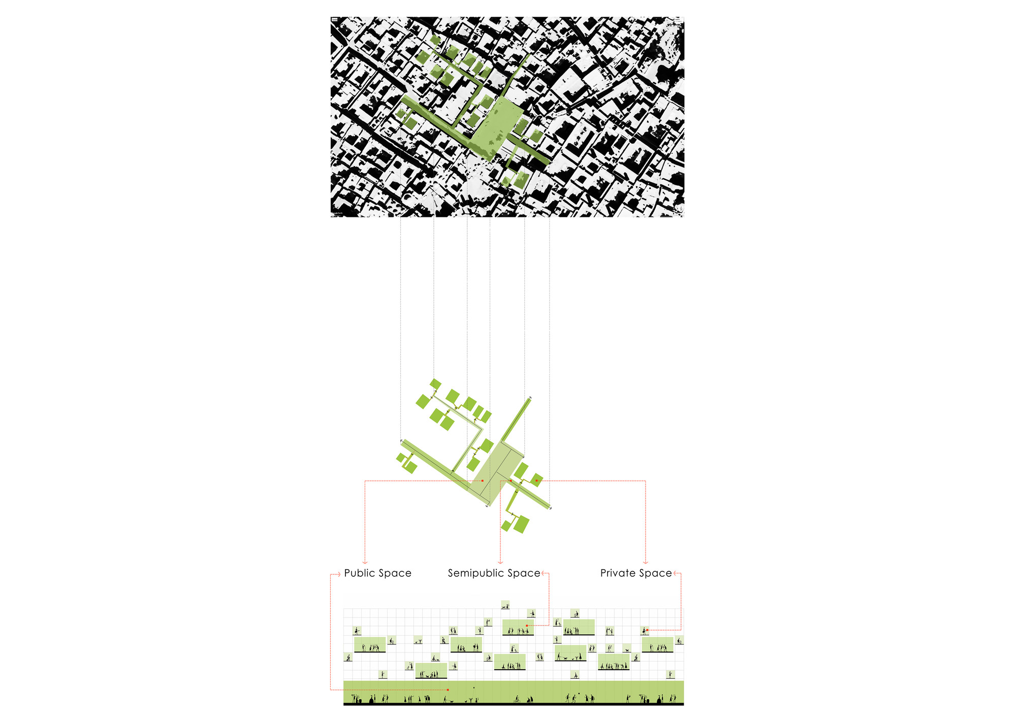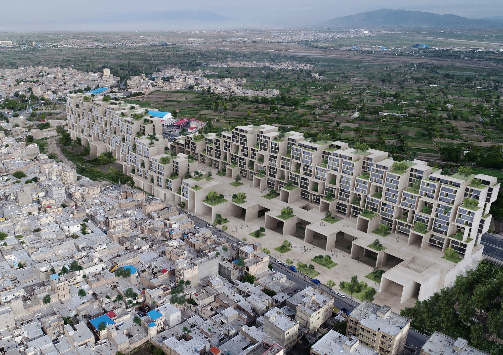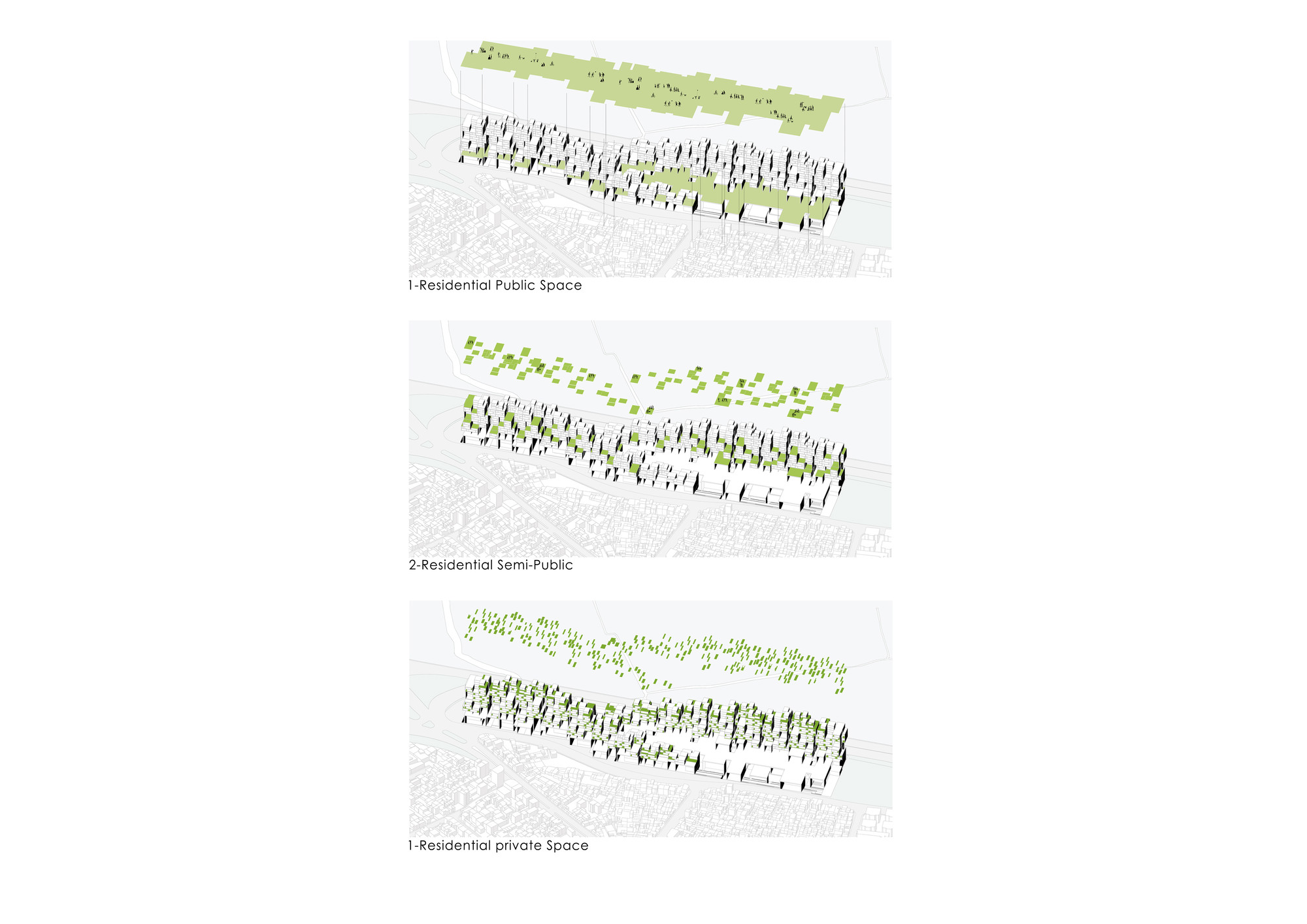 Alongside rural agricultural fields of Tabriz, Ayman Residential Complex covers 300,000 m2 of the city’s deteriorated urban fabric. Considering the adjacent deteriorated fabric, the main design intention was to improve the socio-economic quality of the entire neighborhood. The majority of the residents in the area are the farmers working on the adjacent agricultural fields. Considering the context and the user group as the main design factor, it was decided to create an “organic neighborhood” for the city. In the urban scale, the project is divided into two parts, the public zone (lower levels) and the private residential zone (Upper levels). The lower levels become a social platform, connecting the deteriorated fabric to the farmlands. This platform is provided to the neighbors to showcase their organic products as well as homemade handcrafts. This platform is flexible in terms of function and could host activities ranging from farmers markets to socio-cultural events. This opportunity not only boosts the economic development of the neighborhood but also adds value to the farmlands. The residential fabric on the upper floors is independent from the public zone. In addition to the main private courtyard, the residential levels include common open spaces which are private to each cluster of residential units. Adapting to the traditional culture of Tabriz, each residential unit also includes a roofed balcony. The contiguity of the public platform and the residential neighborhood provides a source of income for the residents of the deteriorated area and allows lower income families to afford a residence in the complex.