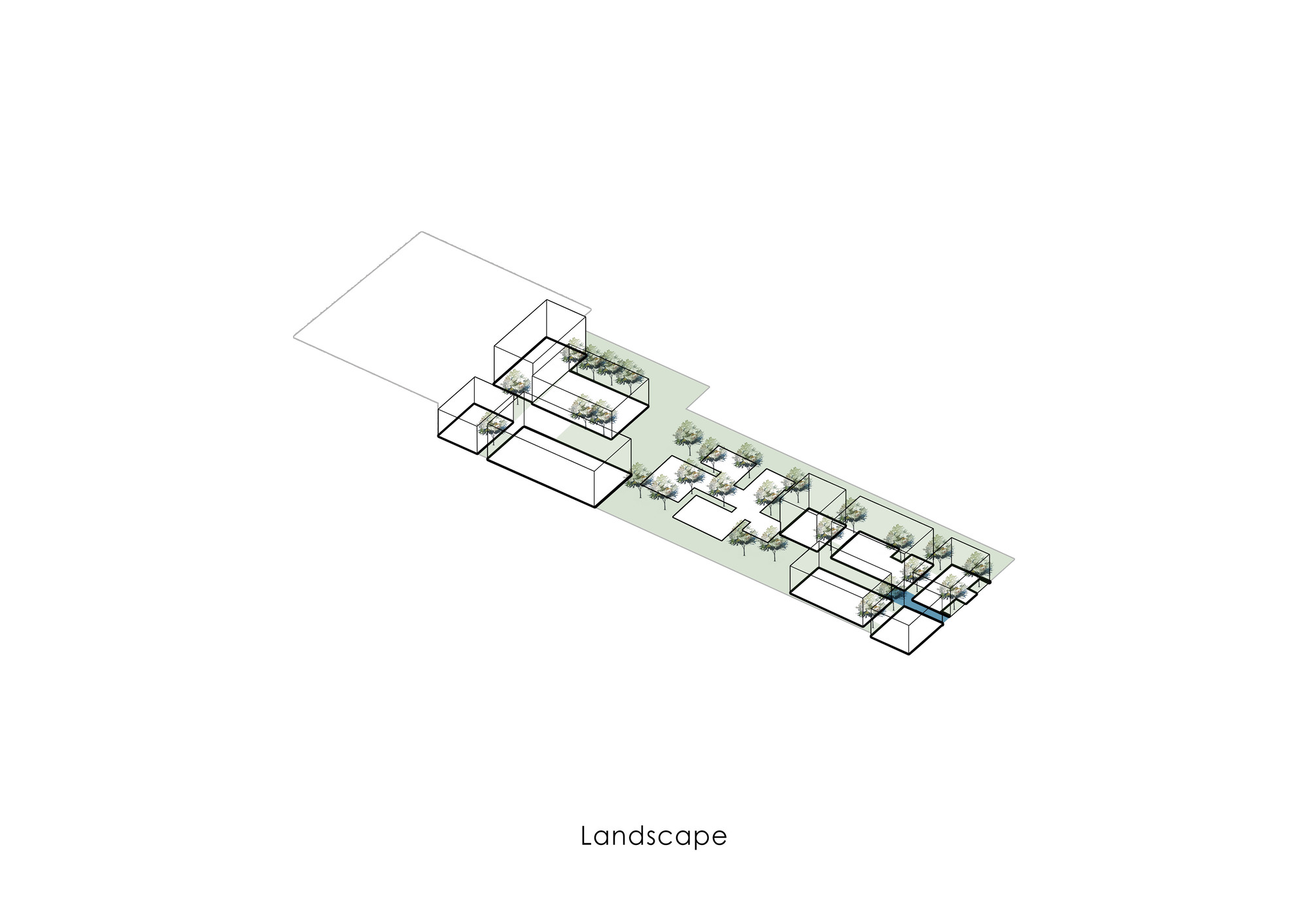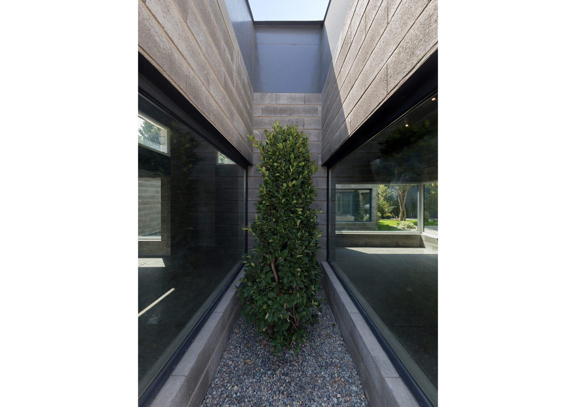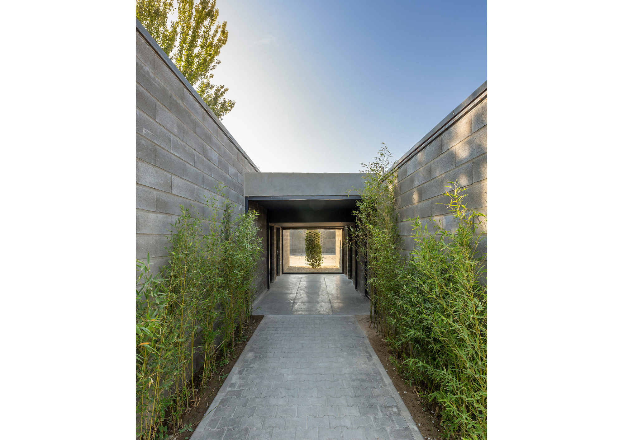 The project brief consisted of an indoor-outdoor showroom, as well as administrative department of Aptus Concrete Block Manufacturing Factory in the suburbs of Karaj. The design process was initiated by considering the everlasting battle between different construction typologies in the suburbs; mainly industrial, agricultural, and inferior residential fabrics. The winner of such combat is usually the low-grade residential development and the losers are landscapes and agricultural fields which are demolished to be replaced by dense and low quality buildings. The design criteria was to create a win-win pattern between greenery and the built environment. Another issue regarding outskirt developments is to provide cost efficient construction solutions which are also aligned with the latest standards. Considering the urge for cost efficiency, it was decided to eliminate finishing layers on the entire interior and exterior of the building and to use company’s concrete blocks as the single material forming the entirety of the building envelope. Based on the initial design criteria, the created building volume forms the exterior and the interior landscape at the same time. Instead of creating a huge “box” surrounded by greenery, it was decided to break the volume into smaller boxes which are independent and characterized based on their function. The created voids between the boxes form greenspaces penetrating into the building. A layered relationship between interior and exterior was formed through transparencies between the boxes. Limiting building materials to a single block enhances the perception of the exterior atmosphere and creates a varying quality of natural light during the day. There are a number of other concrete block manufacturers in the neighborhood of Aptus factory. This project could define a simple pattern for this urban fabric which is not only cost efficient, but also enhances the relationship between the built environment and the greenspace.