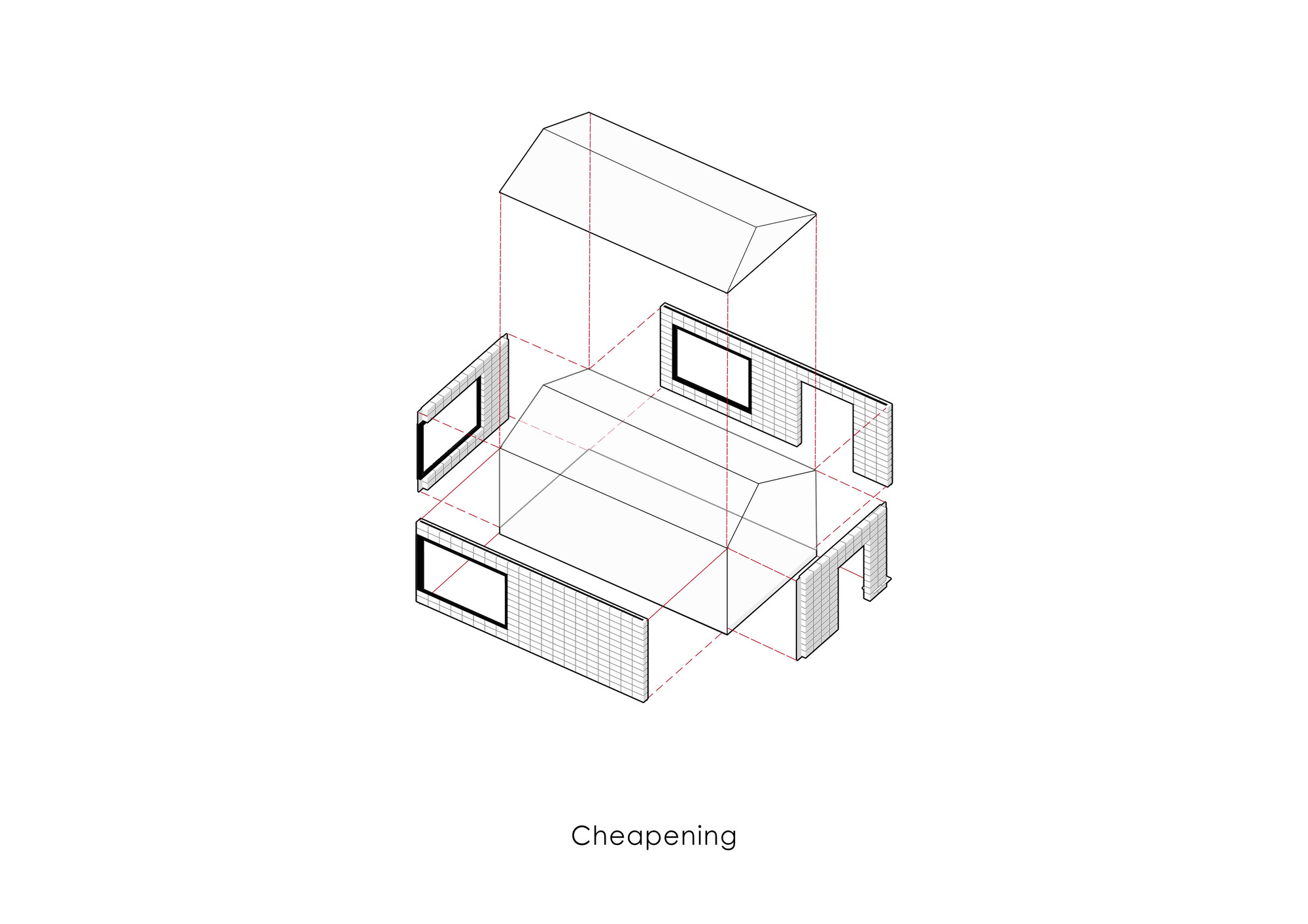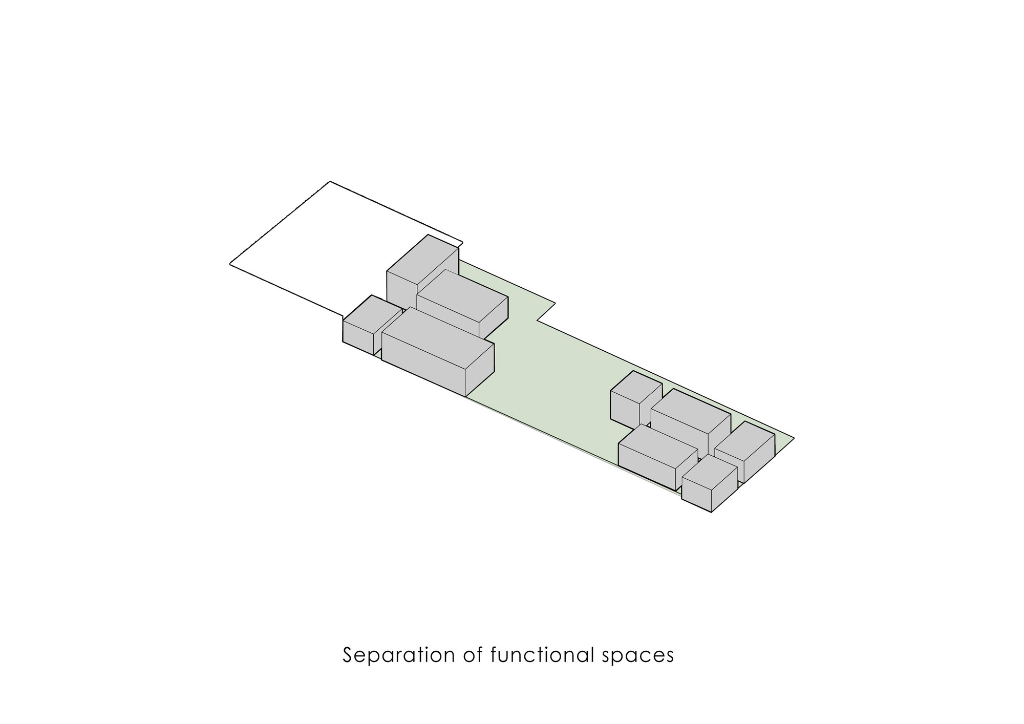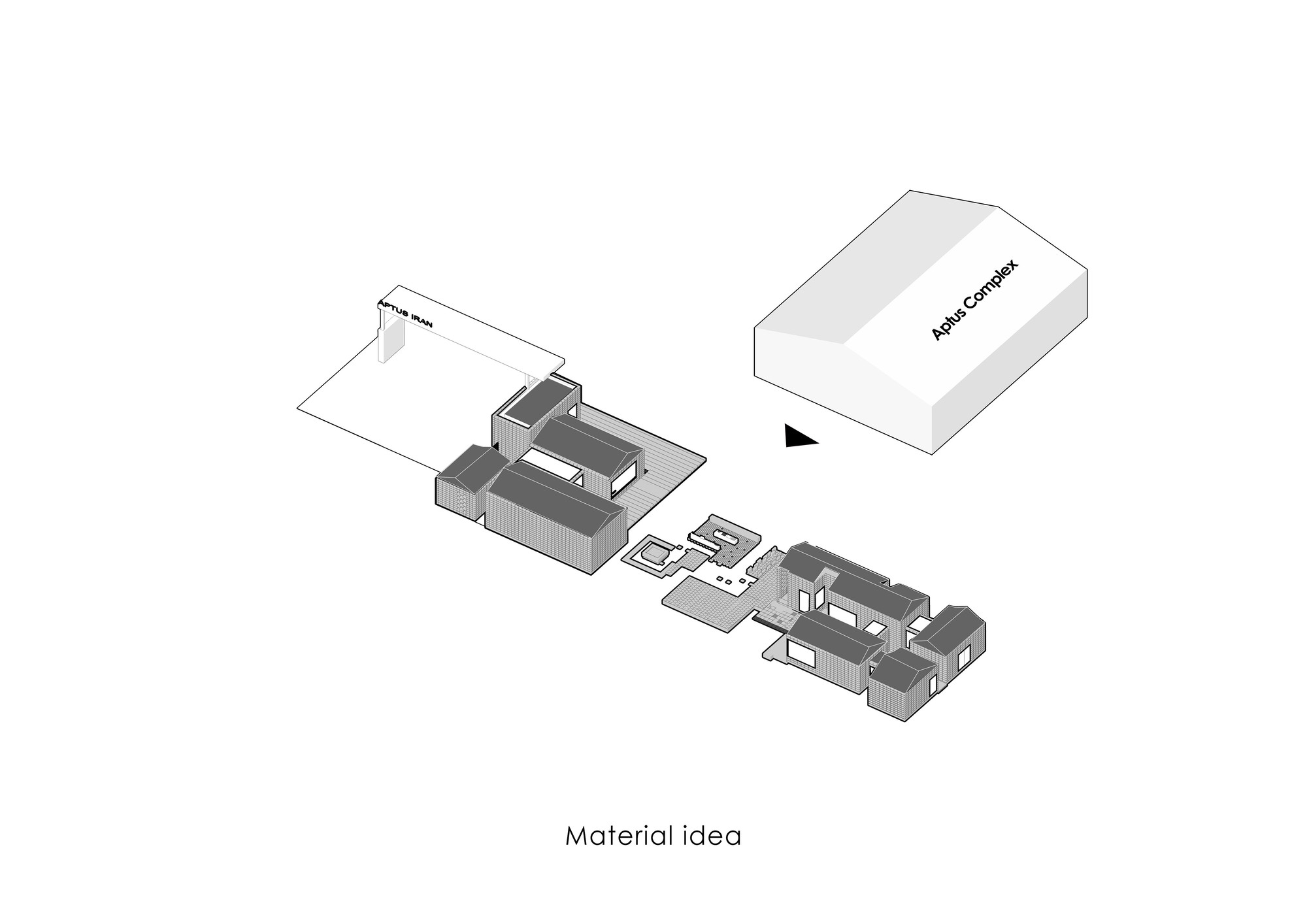 The project brief consisted of an indoor-outdoor showroom, as well as administrative department of Aptus Concrete Block Manufacturing Factory in the suburbs of Karaj. The design process was initiated by considering the everlasting battle between different construction typologies in the suburbs; mainly industrial, agricultural, and inferior residential fabrics. The winner of such combat is usually the low-grade residential development and the losers are landscapes and agricultural fields which are demolished to be replaced by dense and low quality buildings. The design criteria was to create a win-win pattern between greenery and the built environment. Another issue regarding outskirt developments is to provide cost efficient construction solutions which are also aligned with the latest standards. Considering the urge for cost efficiency, it was decided to eliminate finishing layers on the entire interior and exterior of the building and to use company’s concrete blocks as the single material forming the entirety of the building envelope. Based on the initial design criteria, the created building volume forms the exterior and the interior landscape at the same time. Instead of creating a huge “box” surrounded by greenery, it was decided to break the volume into smaller boxes which are independent and characterized based on their function. The created voids between the boxes form greenspaces penetrating into the building. A layered relationship between interior and exterior was formed through transparencies between the boxes. Limiting building materials to a single block enhances the perception of the exterior atmosphere and creates a varying quality of natural light during the day. There are a number of other concrete block manufacturers in the neighborhood of Aptus factory. This project could define a simple pattern for this urban fabric which is not only cost efficient, but also enhances the relationship between the built environment and the greenspace.