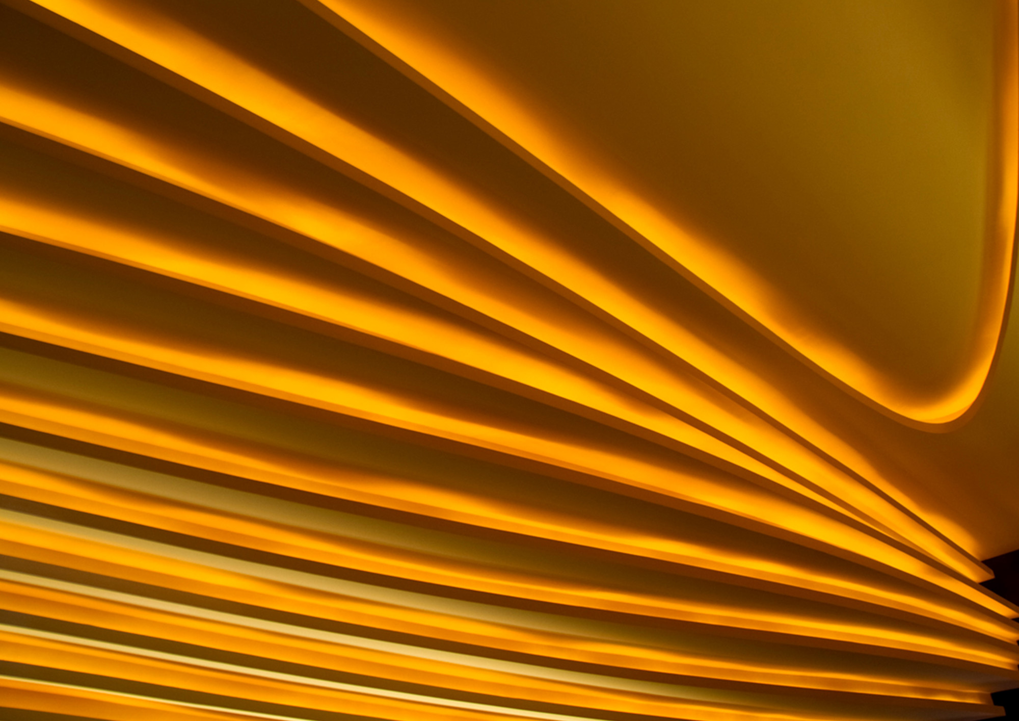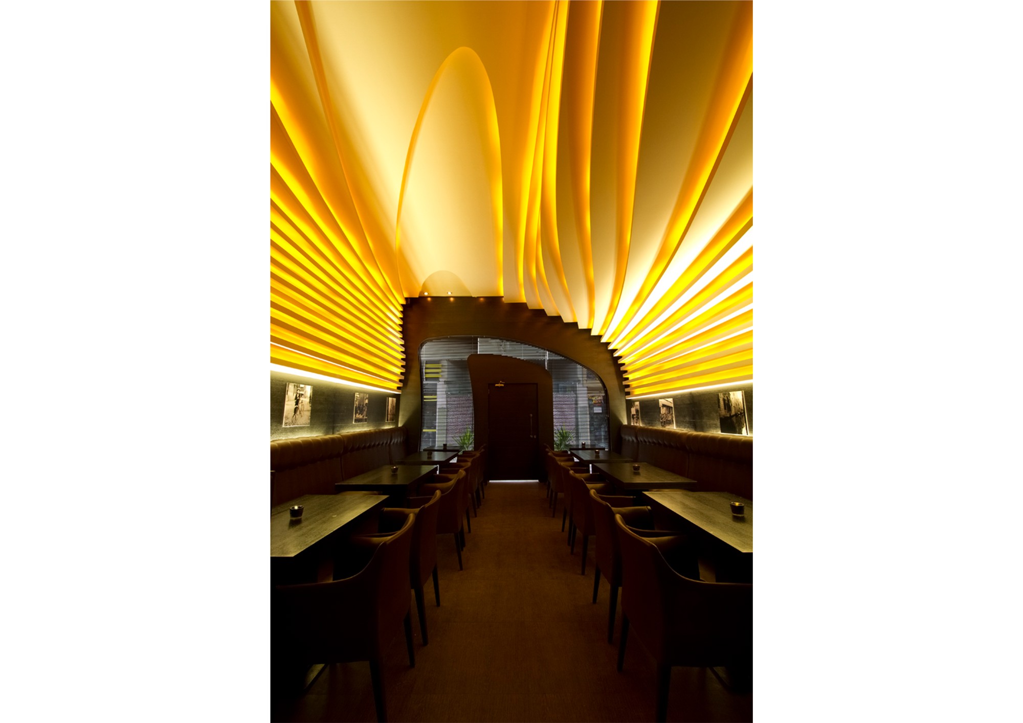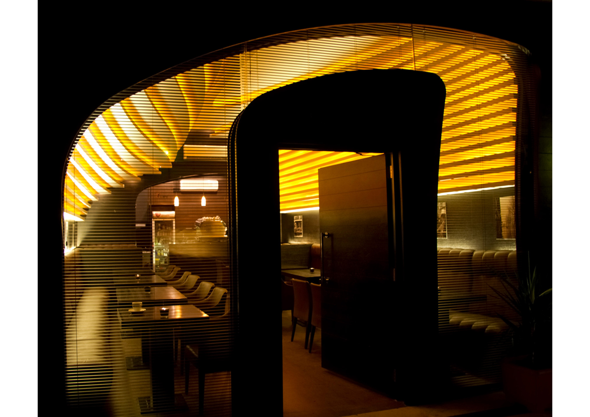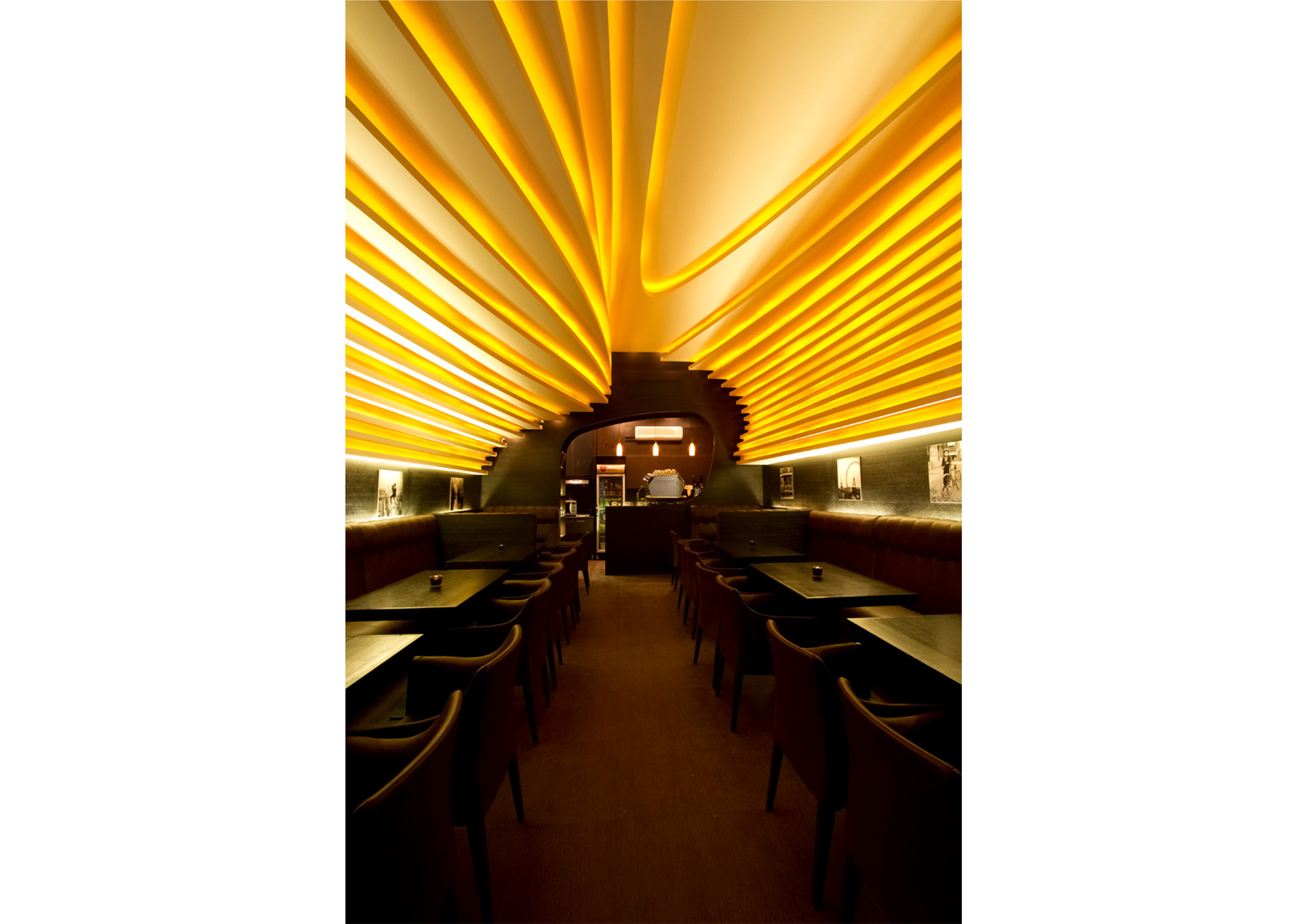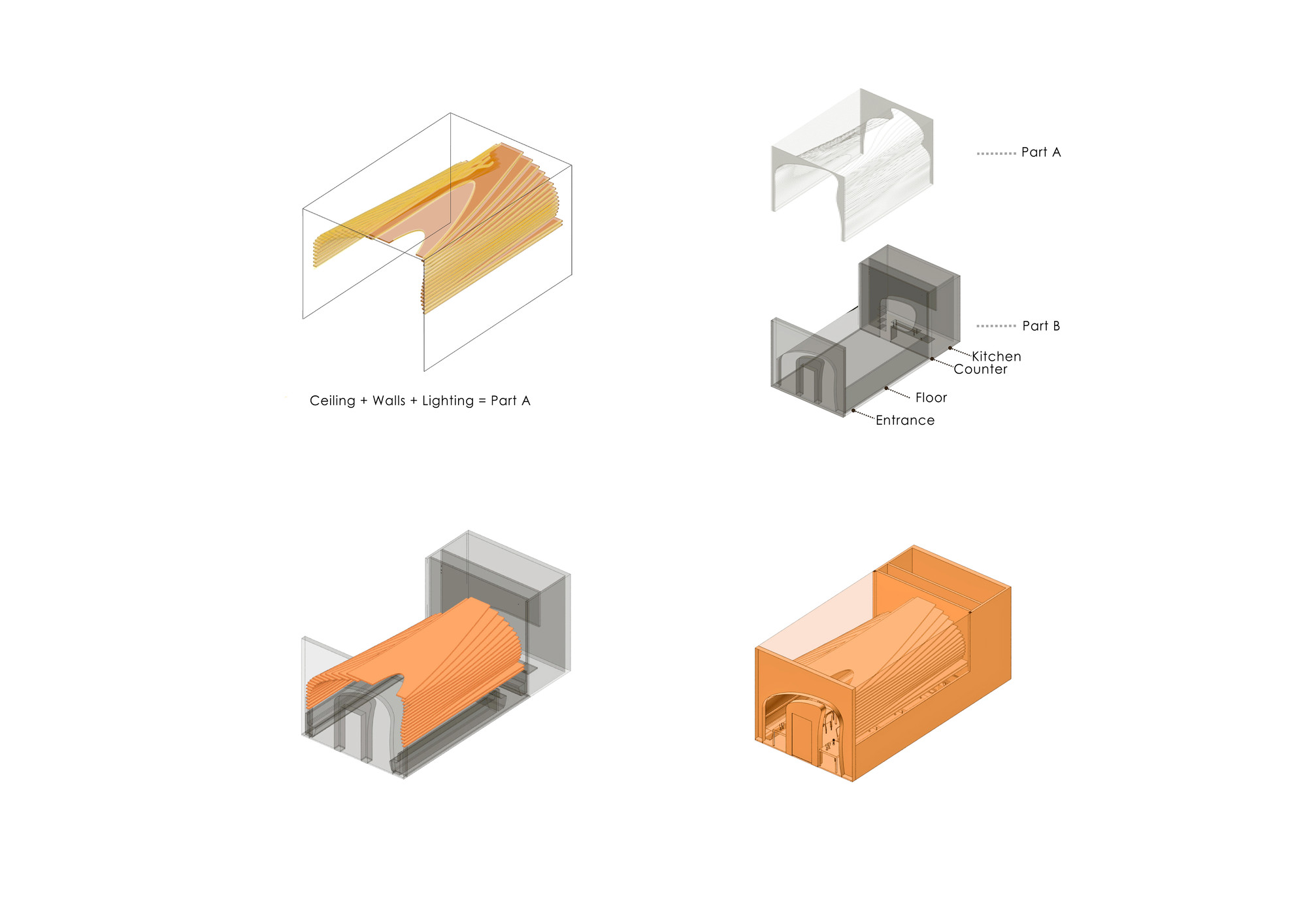 Coffee shop culture is an emerging trend among young Iranians. Most of the youth consider at least one or two of these places as their favourite cozy and comfortable corner to escape from the chaotic city life. With an area of 52 m2, the site of this project was located at the second floor of a two storey shopping mall in Tehran. The primary concern of the client was to have a unique design while keeping the cost at a reasonable range. Having that in mind, the design attempt was to create a distinct character for the coffee shop through a simple and consistent design. Design Criteria: • The primary challenge here was to control the amount of reverberation in the limited volume of the space (4.5m in Height). • The second consideration was to create a dynamic space which provides the customers with a unique experience in every perspective. • Another important design factor was to preserve uniformity in design and to create an integrated space in terms of form and material. • Finally, it was essential to keep the construction process simple and easy to conduct and to choose reasonably priced and easily available construction materials. In terms of function, the project could be divided into two main parts, the kitchen and the main hall. In terms of the architectural elements, on the other hand, the two categories are: A. The north-south wall, and the ceiling B. The east-west wall, the back wall, the entrance, and the flooring In part A, the intention was to integrate the walls, the ceiling, and the lighting system into a consistent form created by the morphing of two curves. The resulting 3-Dimensional surface was then transformed into cross sectional layers. This transition not only makes the implementation easier, but also increases the noise absorption by multiplying the surface area. LED strip lights were then implemented within the layers, creating a calming indirect lighting for the dining area. In order to reduce the construction cost, all the cross sections were plotted one to one. The aluminum frames were then bended accordingly, covered with a layer of plaster, and coated with acrylic paint. The final cost of the material and the construction of the ceiling and wall layers turned out much less than most of the common construction methods. For part B the material selection was limited to the dark brown wood and leather used to form most of the interior elements including the entrance wall, the floor, the furniture, the counter, and the kitchen area. The shape of the entrance and the counter wall was formed by the two curves of part A. Parts A and B complement each other to form the cubical space of the project. The material and color palettes were kept simple to better highlight the main idea and the lighting quality of the project.