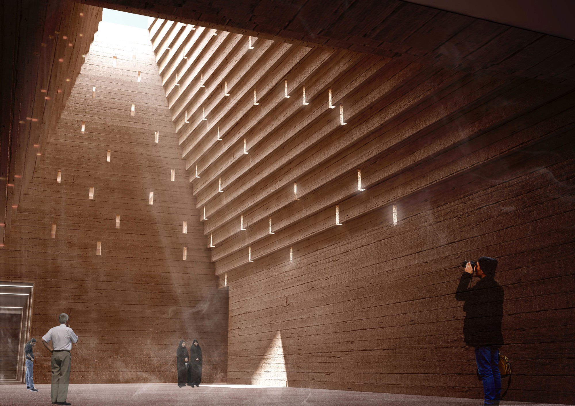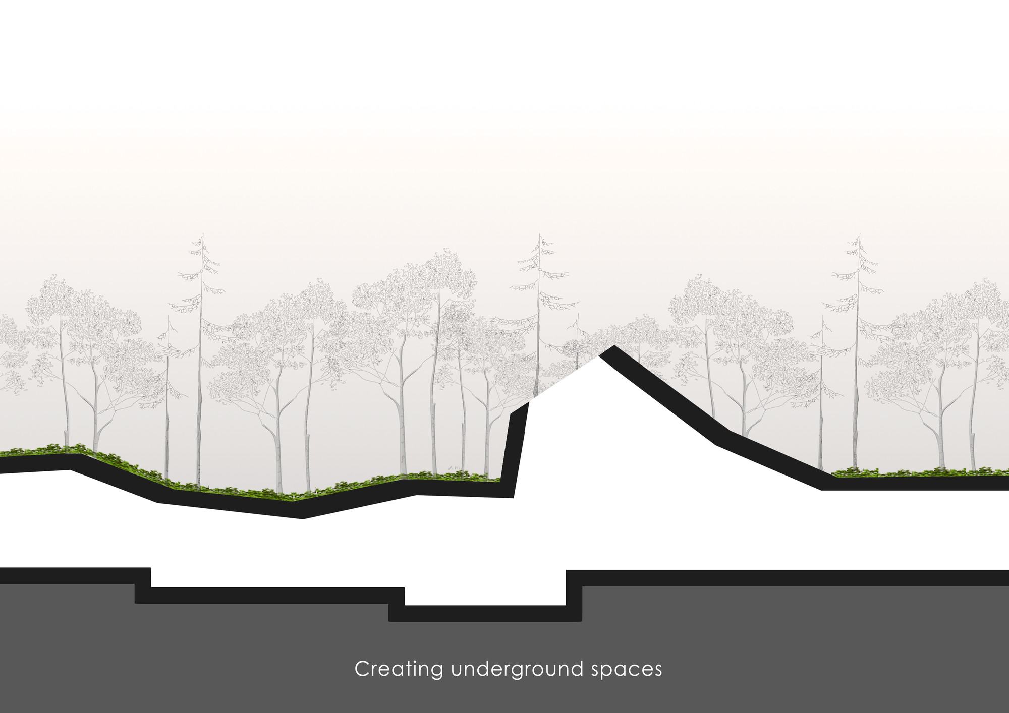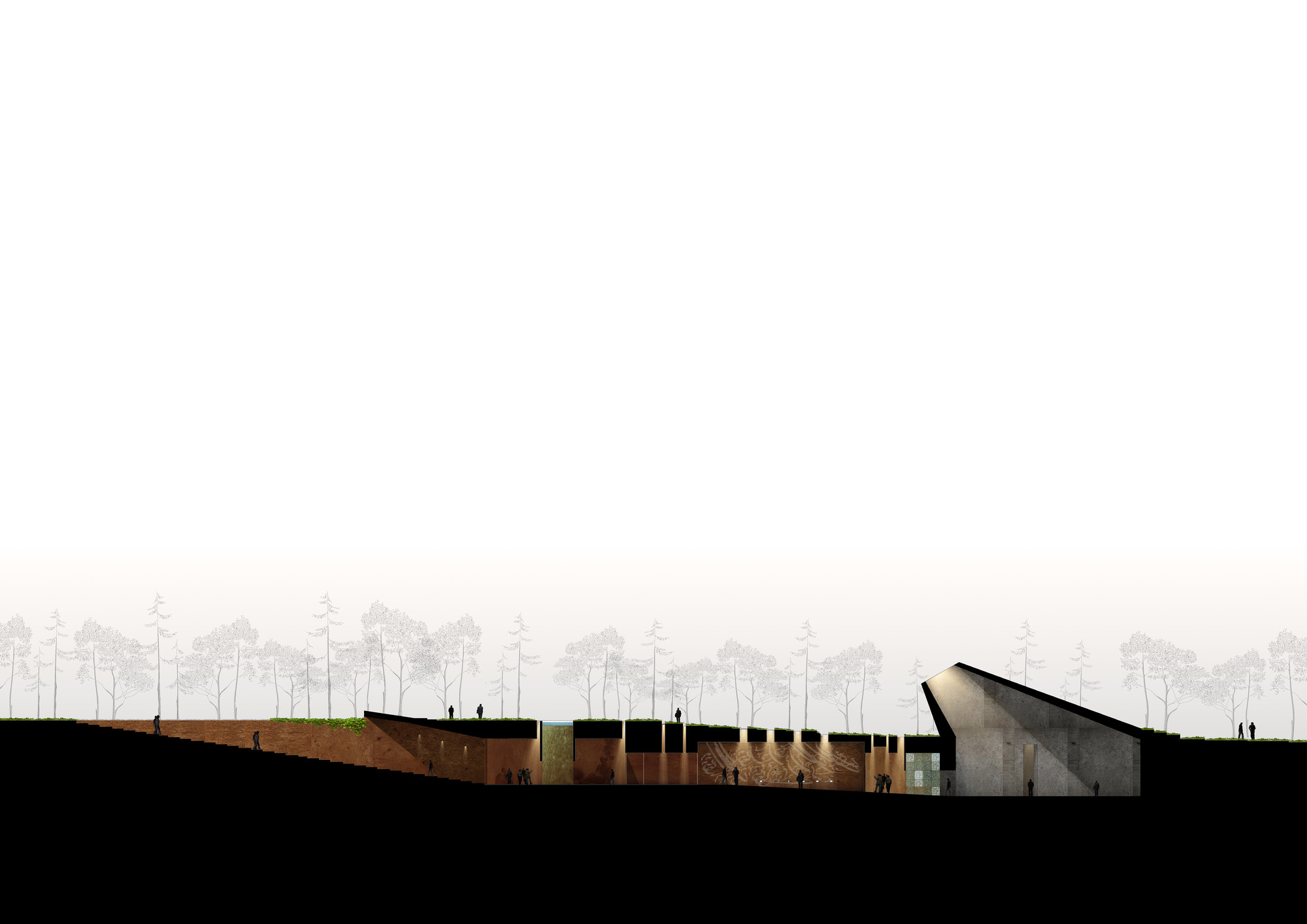 The first step in the design process was to investigate the morphological network of Behesht-E-Zahra Cemetery and Imam Khomeini Shrine. This network was depicted to form the geometry of the site and its components. One of the main design criteria was to create a modest building in relation to the Shrine. Therefore, it was decided to keep the ground as the dominant design element. The entire building spaces were taken underground with only some elements above the ground surface to represent the building. The underground spaces are in 3 categories: • Main underground spaces: spaces with high ceilings and vast areas used as platforms for social and group activities. The open plan design of these spaces enables users to perform a wide range of activities. These spaces were designed for experimental and group activities. • Secondary underground spaces: smaller spaces with lower ceilings relative to the main spaces to be used for administrative and service purposes. Moreover, these spaces could be used as workshops for production of what is going to be showcase in the galleries. These spaces were designed as a platform for discussion and research. • Connecting paths: these spaces are narrow and lengthy and could be used to showcase artworks. The art pieces produced by the artists in the workshops could be presented in these spaces. This category of spaces were designed as a platform for production and representation. The design vision in this project gone beyond designing within the site boundary and extended to the adjacent local fabric to form an open museum in the political-historical context of Jamaran area. The proposed physical program includes a pathway which passes through focal points of the cemetery and introduces the visitors to the historical and political importance of this significant landmark of Tehran. There are guidelines implemented along this path to provide important information about the site. This pathway eventually reaches the interior pathway of the museum.