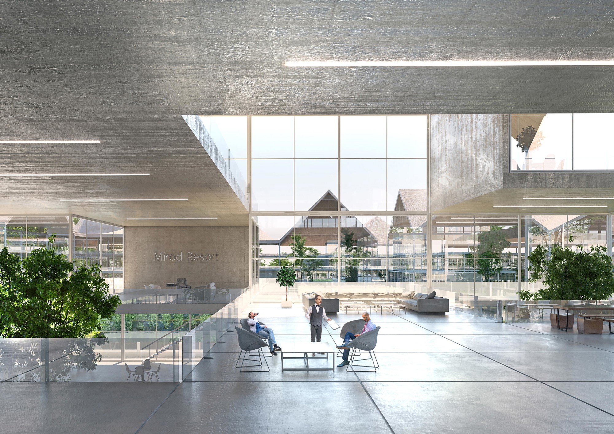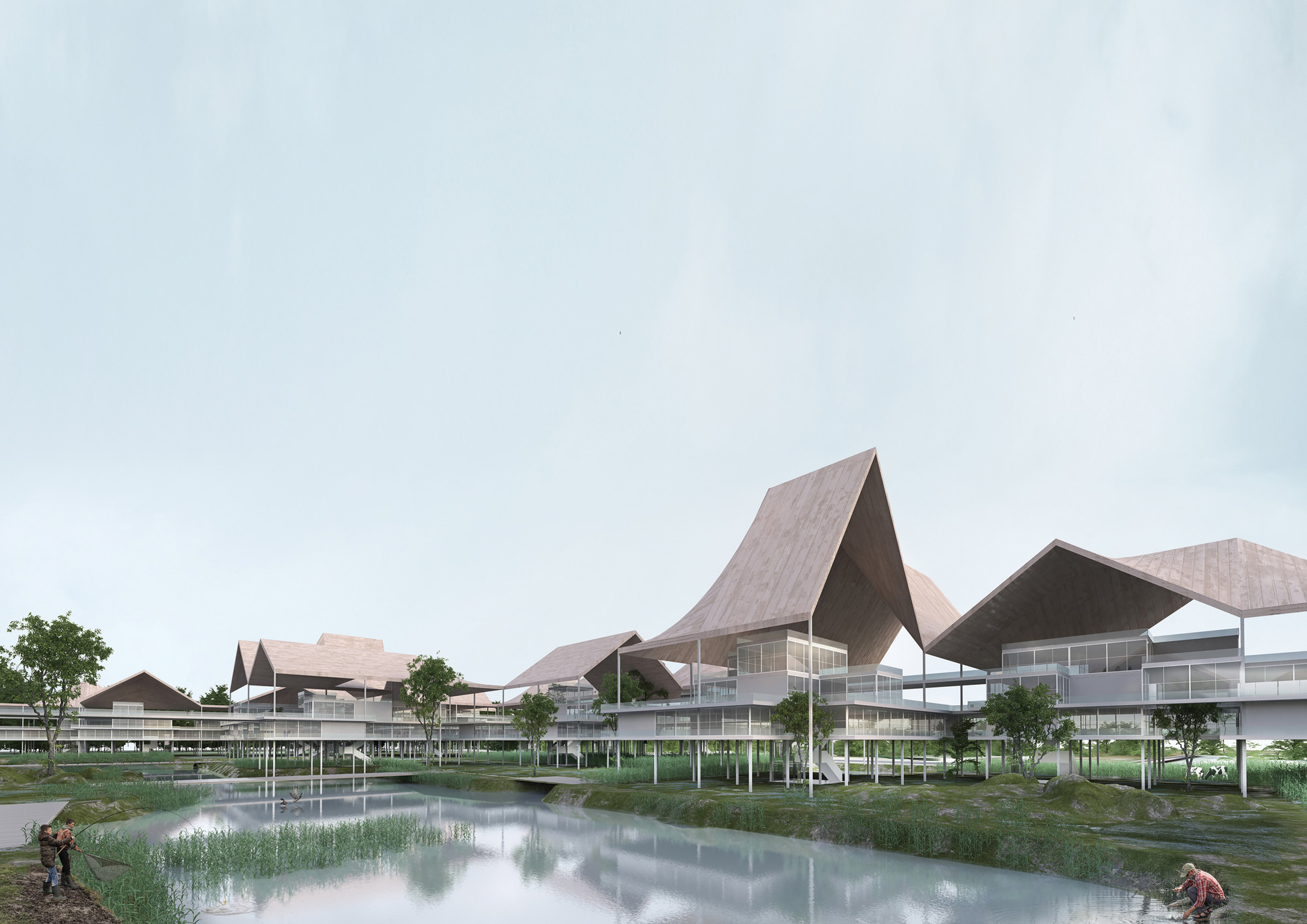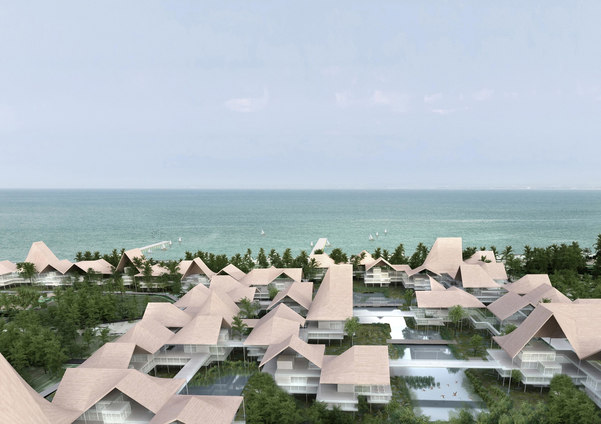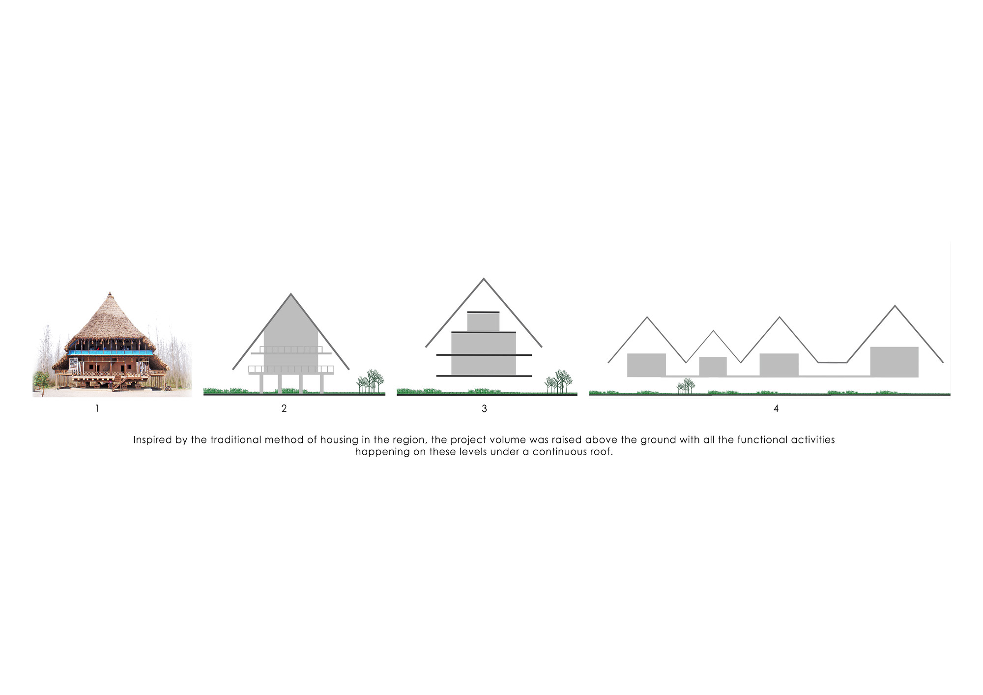 Rapid growth of the tourism industry in the north of Iran has resulted in unstructured developments, causing damages to the ecosystem and the natural resources in the region. The site of this project was one of the few remaining untamed coastal lands of the Caspian Sea. The design intention was to protect the ecological values of the area and to create an appropriate typology model for an ecotourism village in the entire region. The complex consists of hotels and restaurants, along with shopping malls and recreational facilities. Inspired by the traditional method of housing in the region, the project volume was raised above the ground, leaving the land natural and untamed. All the functional activities happen on levels raised above ground and under a continuous roof. The continuous roof over the entire volume creates semi open spaces which are suitable for outdoor-indoor public activities. The overall shape of the complex was formed in a way to fade the border between the building and nature.