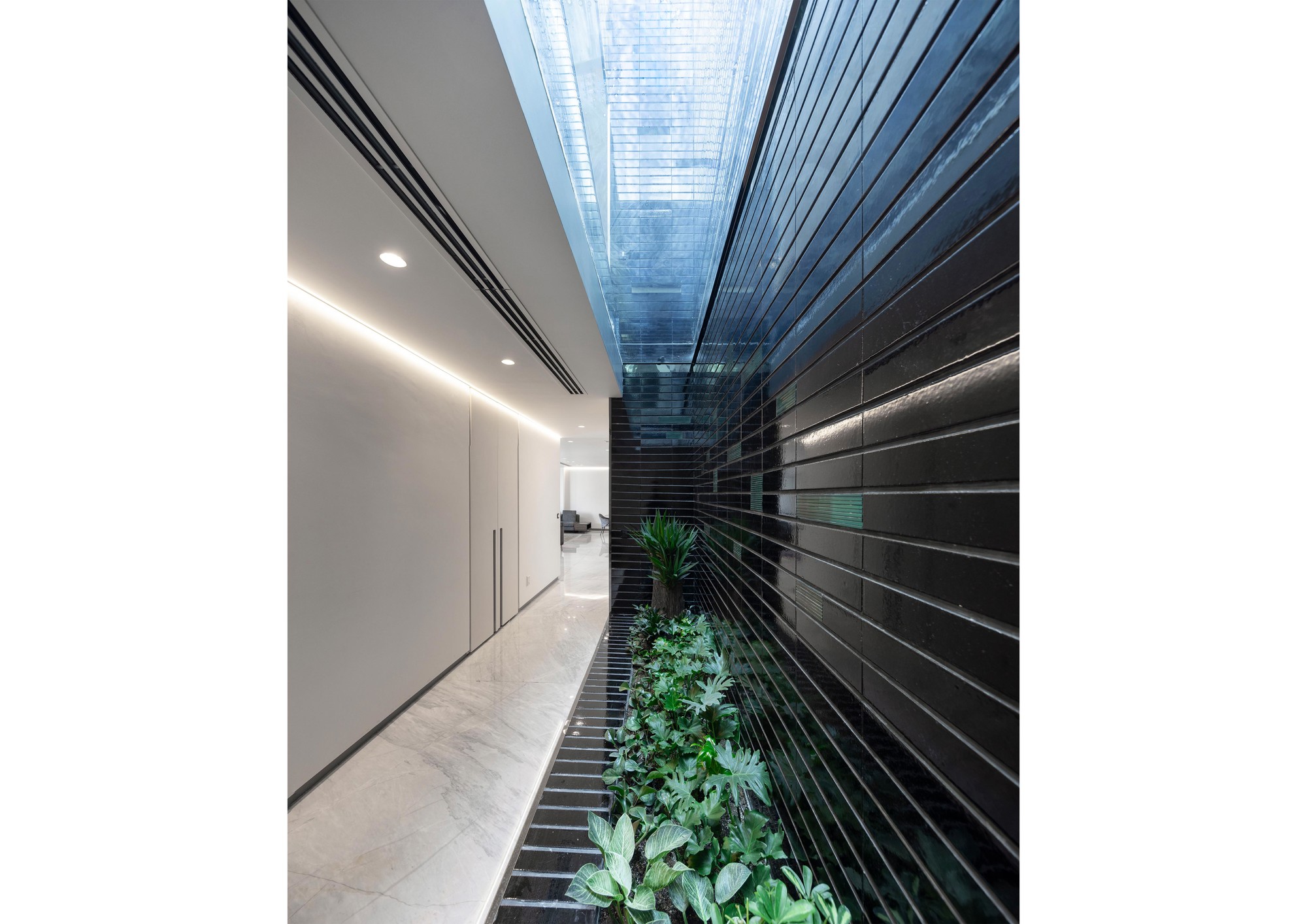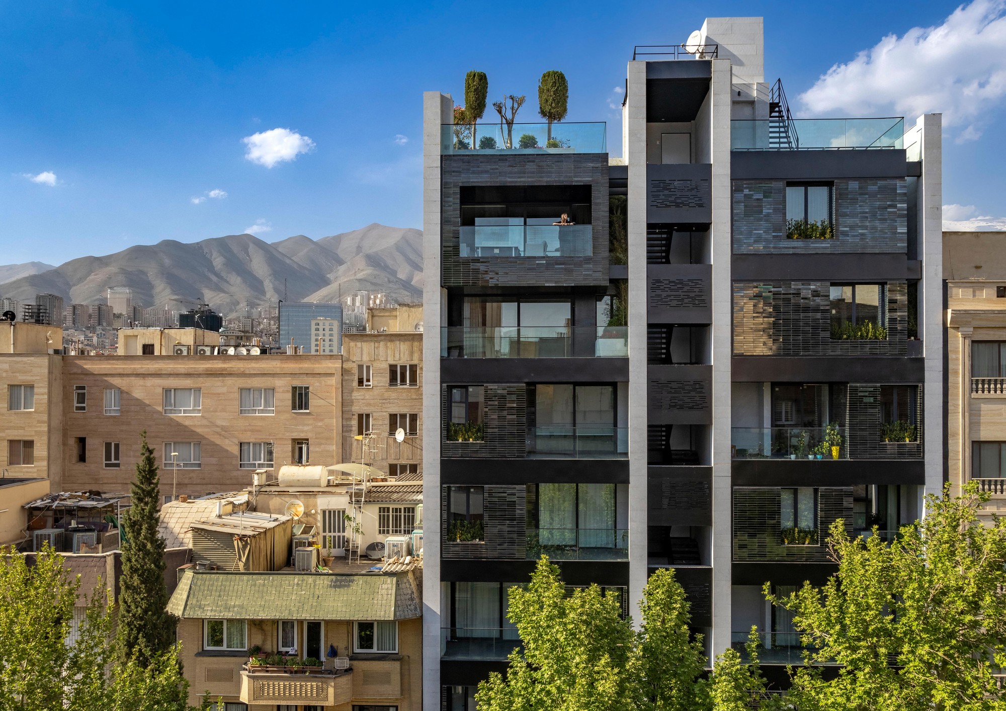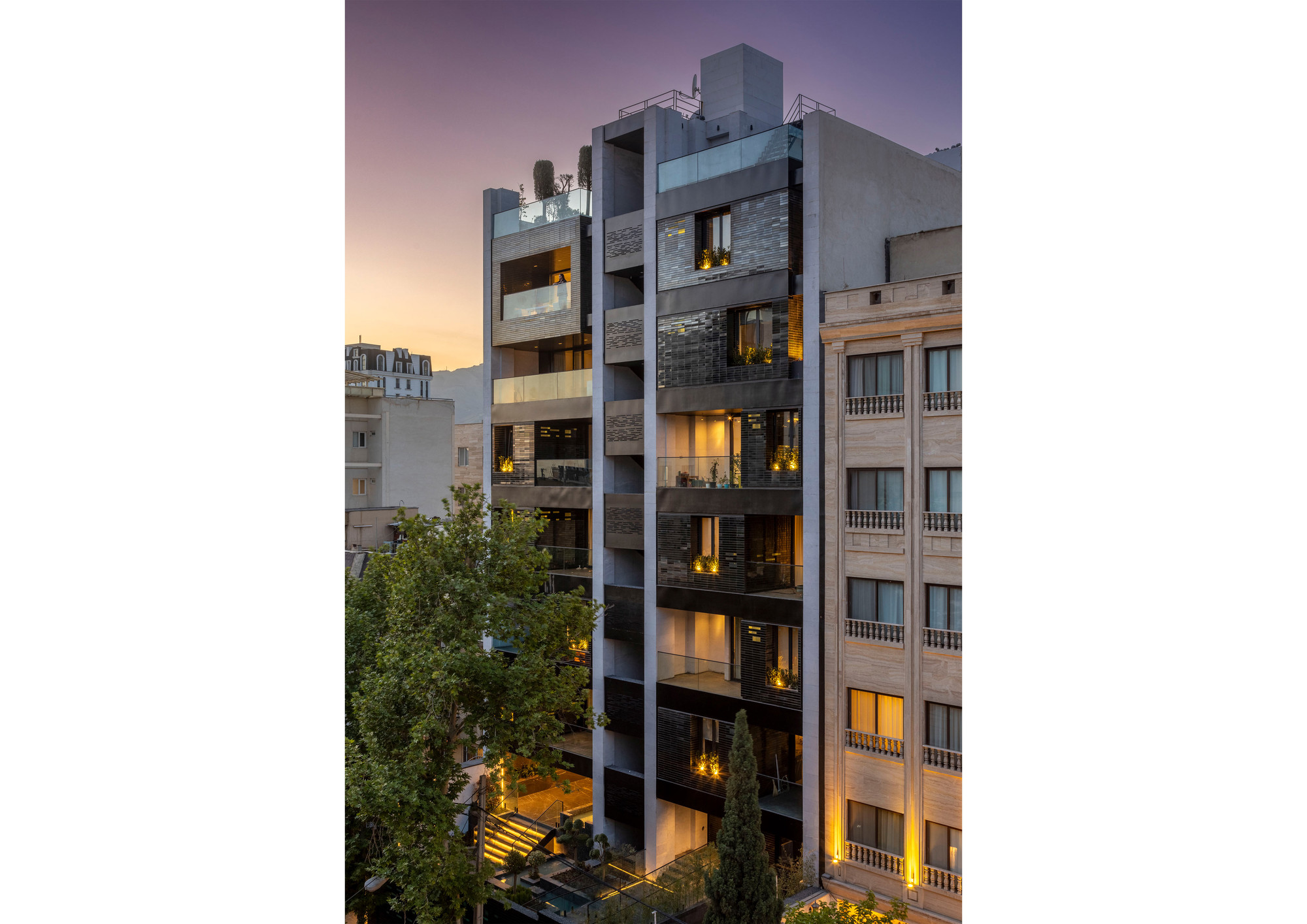 Moj residential building was introduced to our office when the structure was partially built. One of the most important aims for us was to create and develop a new “infield” building typology which is also applicable to other projects in the city. One of the main issues in typical apartments in Tehran is that the front yard in the northern blocks is underused and is not suitable for seating and gathering, because these spaces are mostly used to provide access to the parking. On the ground floor of this project, the space between the two walls was turned into a semi-open space for the residents to relax and enjoy the view of the adjacent yard. This space could act as a substitute for the front yard. On the 5th and 6th floors, the project volume deviates from the walls to enable vertical light wells on the exterior and interior volume of the building in the form of green spatial voids. This act improves the living quality of the units as the penthouses of the building. The material palette of the project was formed based on 3 components: 1. The vertical walls, embracing the structural columns, made of white crystal stone 2. The volumetric mass, covered with dark colored glazed brick, with glass blocks in between bricks wherever possible. The penetrating voids inside the spaces are also taken into consideration as masses and the same material was used to cover them. The material idea on this part was formed to reflect the light from the environment and the surrounding colors. 3. Black metal sheet, defining floor slabs (horizontal lines defining the floors).