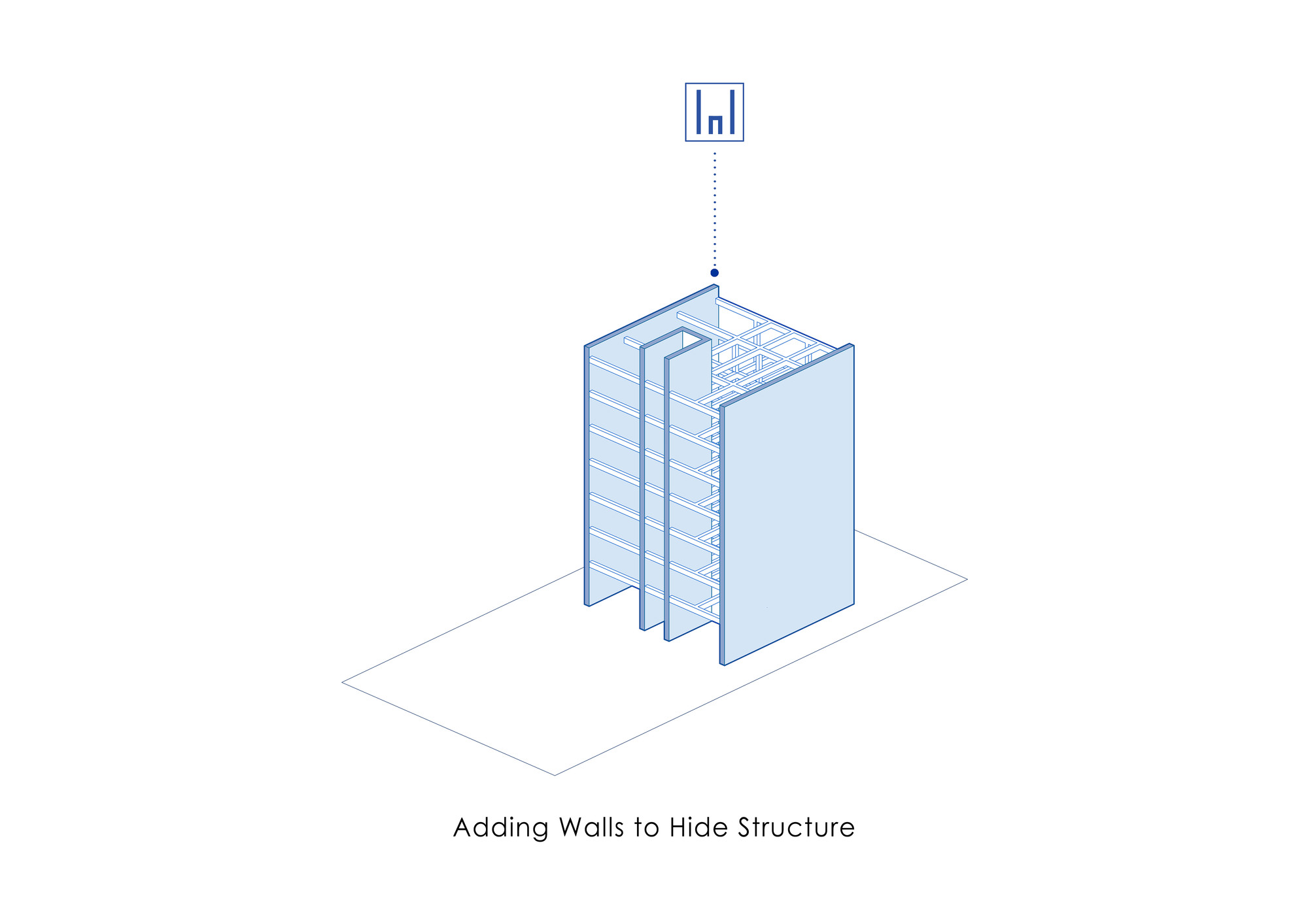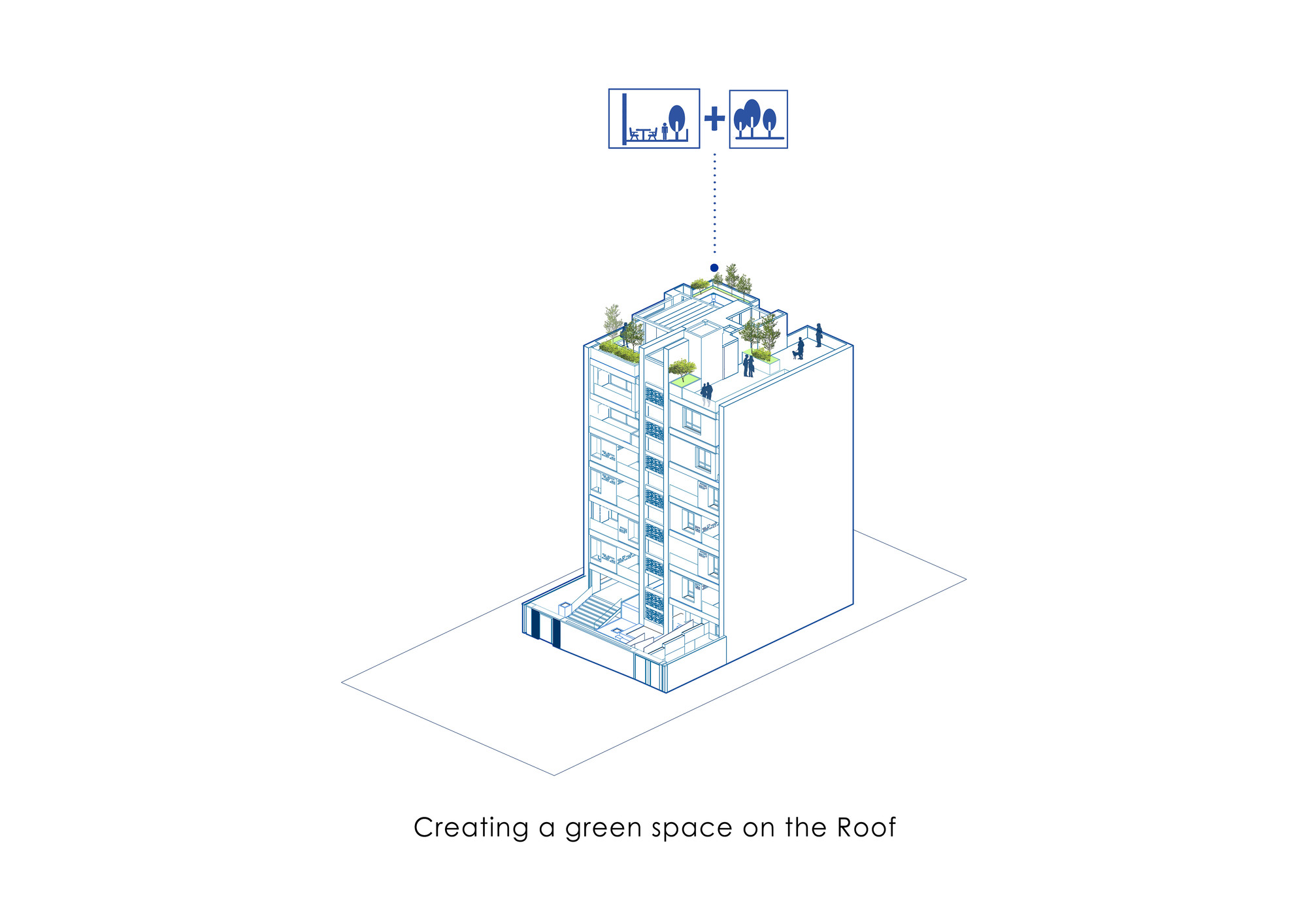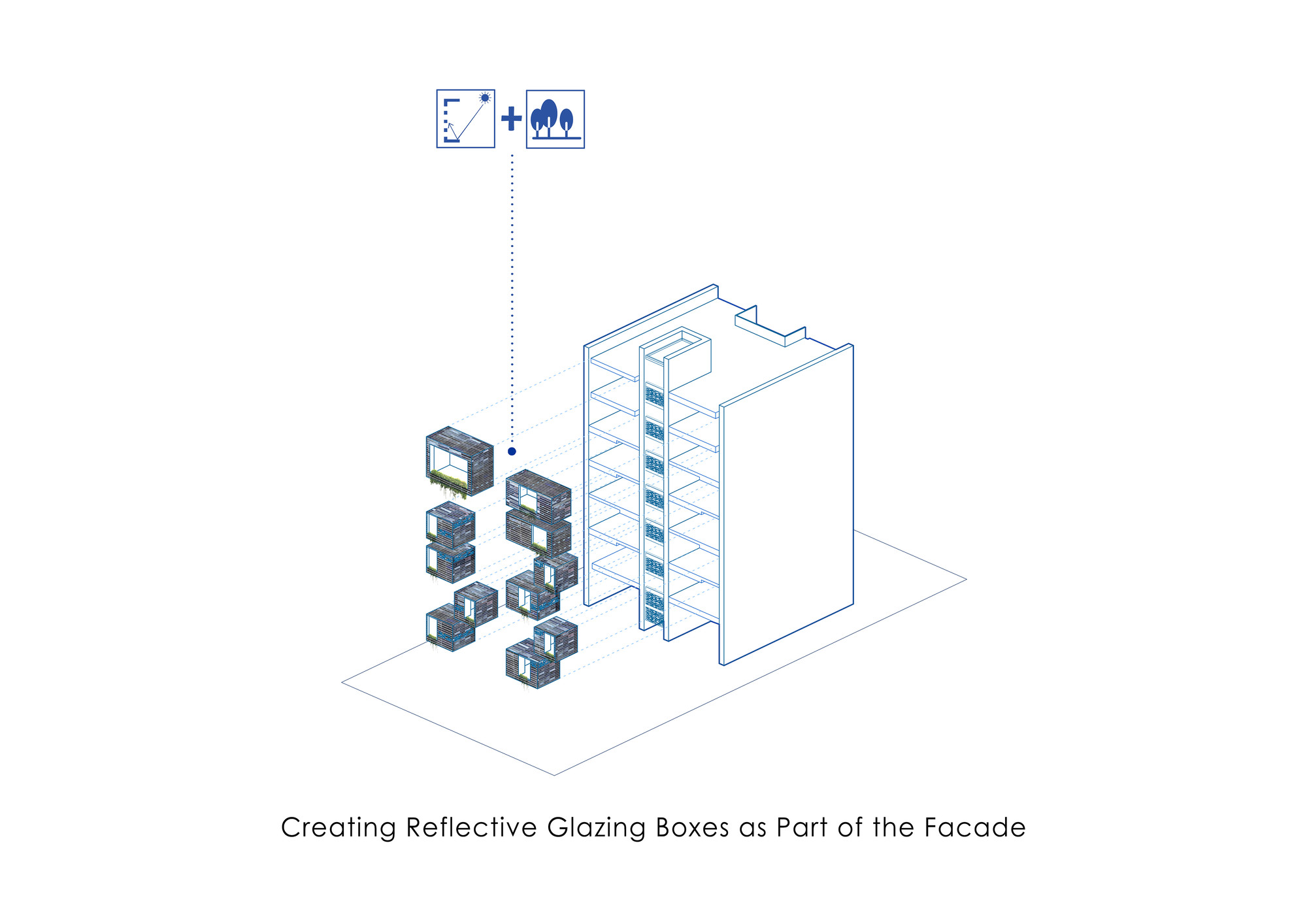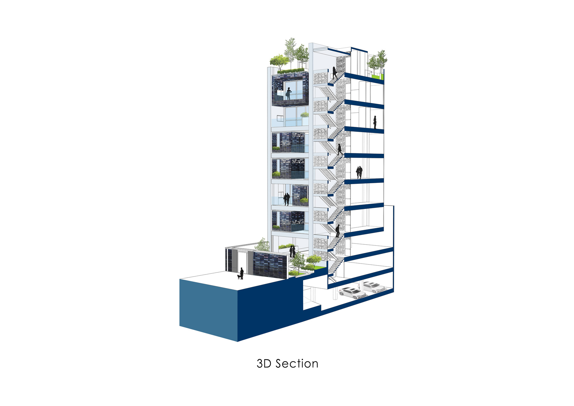 Moj residential building was introduced to our office when the structure was partially built. One of the most important aims for us was to create and develop a new “infield” building typology which is also applicable to other projects in the city. One of the main issues in typical apartments in Tehran is that the front yard in the northern blocks is underused and is not suitable for seating and gathering, because these spaces are mostly used to provide access to the parking. On the ground floor of this project, the space between the two walls was turned into a semi-open space for the residents to relax and enjoy the view of the adjacent yard. This space could act as a substitute for the front yard. On the 5th and 6th floors, the project volume deviates from the walls to enable vertical light wells on the exterior and interior volume of the building in the form of green spatial voids. This act improves the living quality of the units as the penthouses of the building. The material palette of the project was formed based on 3 components: 1. The vertical walls, embracing the structural columns, made of white crystal stone 2. The volumetric mass, covered with dark colored glazed brick, with glass blocks in between bricks wherever possible. The penetrating voids inside the spaces are also taken into consideration as masses and the same material was used to cover them. The material idea on this part was formed to reflect the light from the environment and the surrounding colors. 3. Black metal sheet, defining floor slabs (horizontal lines defining the floors).