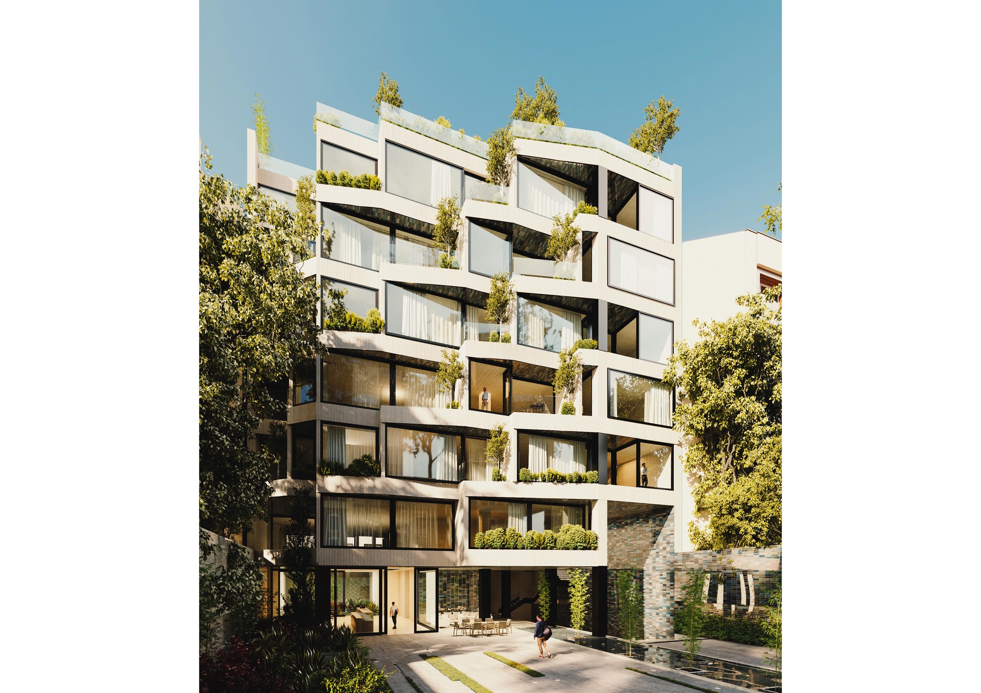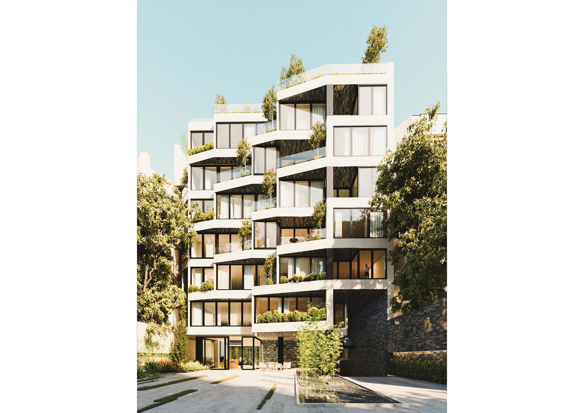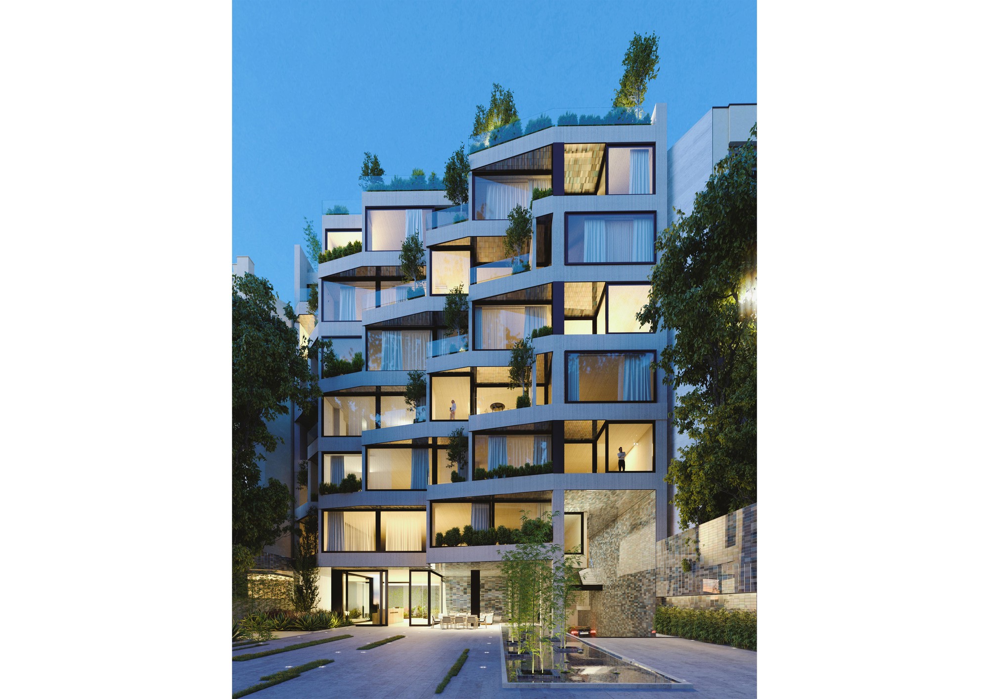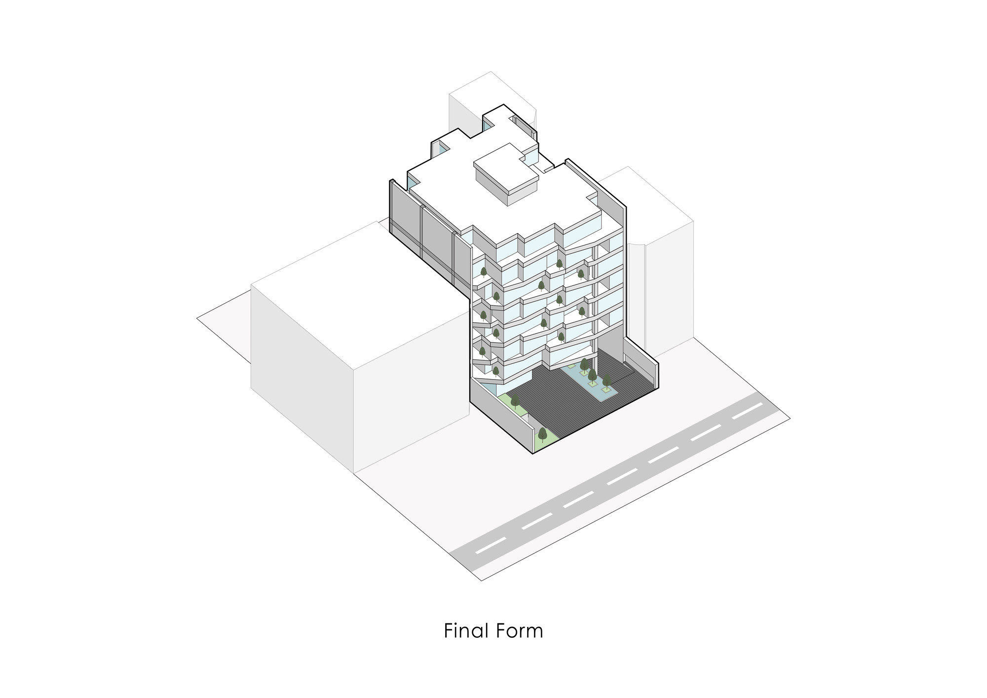 Farhang Residential Building is an infill project located in Tehran. Over the years, HOOBA Design Office has focused on developing adaptable apartment patterns that address various urban regulations, materials, modern living patterns, sustainability, and other relevant issues. Projects are shaped by their site-specific conditions, transforming these factors into parameters for rethinking and innovating conventional apartment design patterns. These parameters act both as opportunities and constraints within the project. The primary challenge in such projects lies in revisiting standard methods in urban apartment design. We believe that redefining infill housing patterns, which constitute a significant portion of the country’s construction volume, is a critical architectural endeavor. In the context of modern urban development, the top-down approach of Iran’s urban master plans has led to suboptimal architectural patterns for residential apartments. Many municipal regulations require architects to critically review and adapt them to foster growth in residential housing design. Farhang project’s location and accessibility offered unique opportunities for rethinking design patterns in this apartment typology. The site is bordered by a dead-end alley on its northern side and a 12-meter-wide street on the other. Along the main façade (facing the 12-meter street), the neighboring buildings were not aligned due to the street’s geometry. Considering municipal regulations (60% building footprint plus a 2-meter) the first challenge was to develop a building mass geometry that simultaneously addressed density requirements and contributed to the architectural layout. This geometry also influenced the distribution of units and the articulation of solid and void elements in the façade. The resulting geometry not only organized the open, semi-open, and closed spaces of the project but also enhanced the quality of residential spaces. For example, terraces in the building are designed with tall green spaces, ensuring most units benefit from these features. One of the project’s key potentials was the connection between the courtyard and landscape with the dead-end on the eastern side. This connection created a dynamic interaction between the urban fabric and the project’s landscape. From a volumetric perspective, the project emphasized the observer’s perspective and prioritized this aspect in its design. This focus influenced the materiality of the project, where reflective silver-glazed bricks were used on fragmented volumetric edges. These materials enhanced the perception of the building from the observer’s viewpoint. In urban projects, flat two-dimensional façades lack depth and meaning. By incorporating reflective materials, the relationship between the observer and the building is amplified. Additionally, this approach enhances the quality of open and semi-open spaces within the apartment design, creating a more engaging and dynamic architectural language.