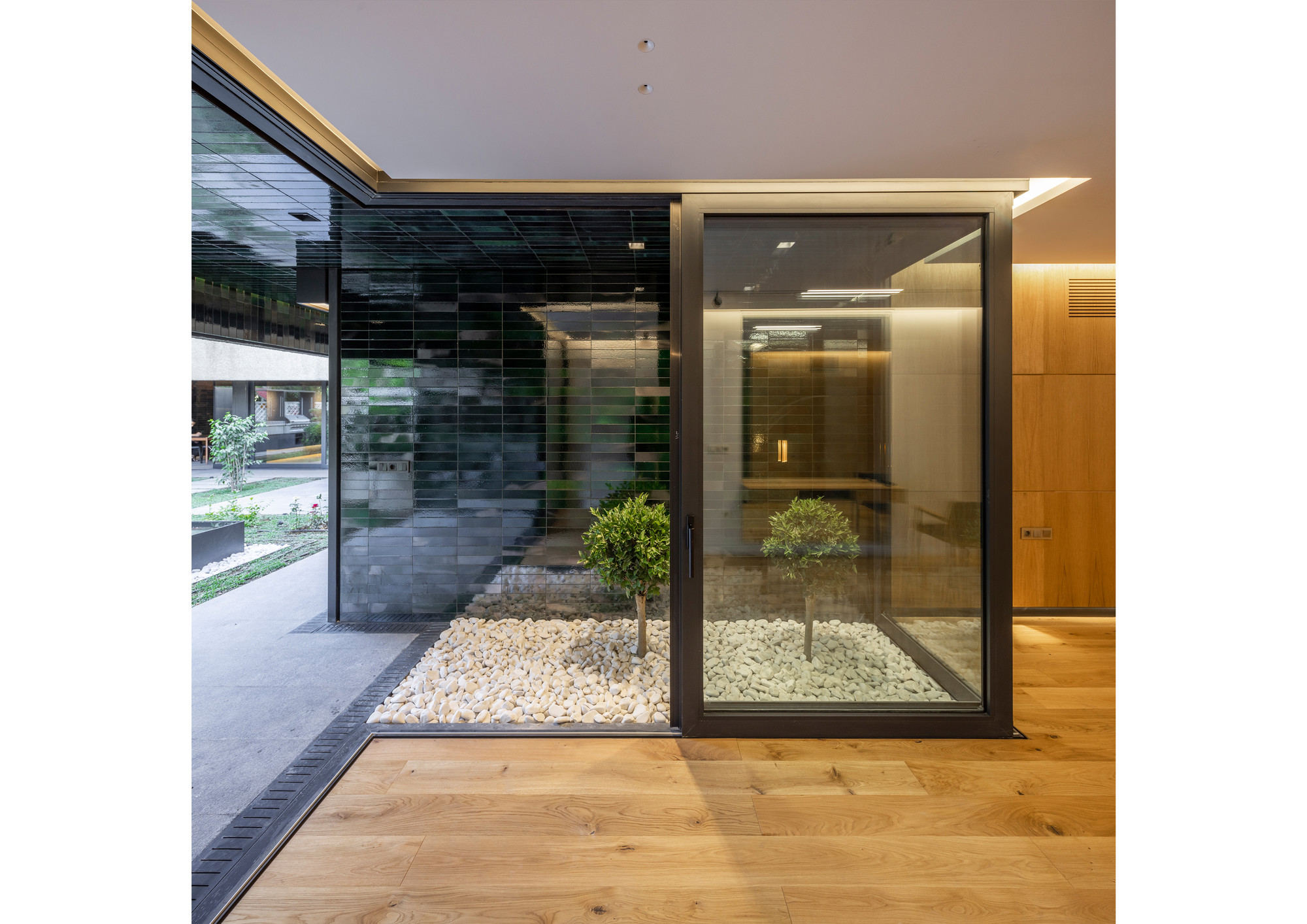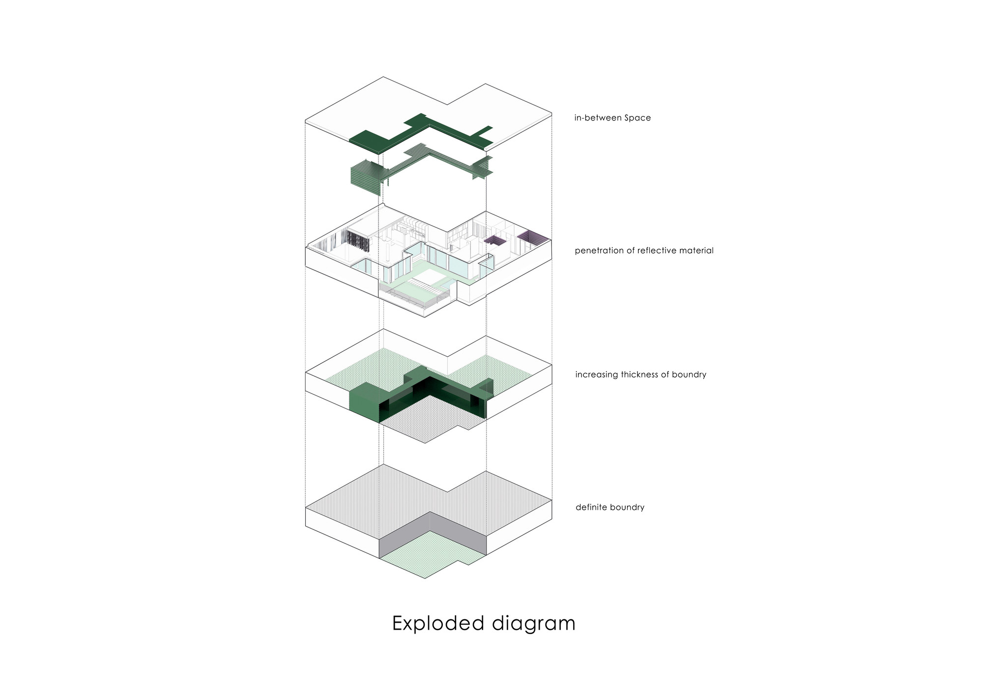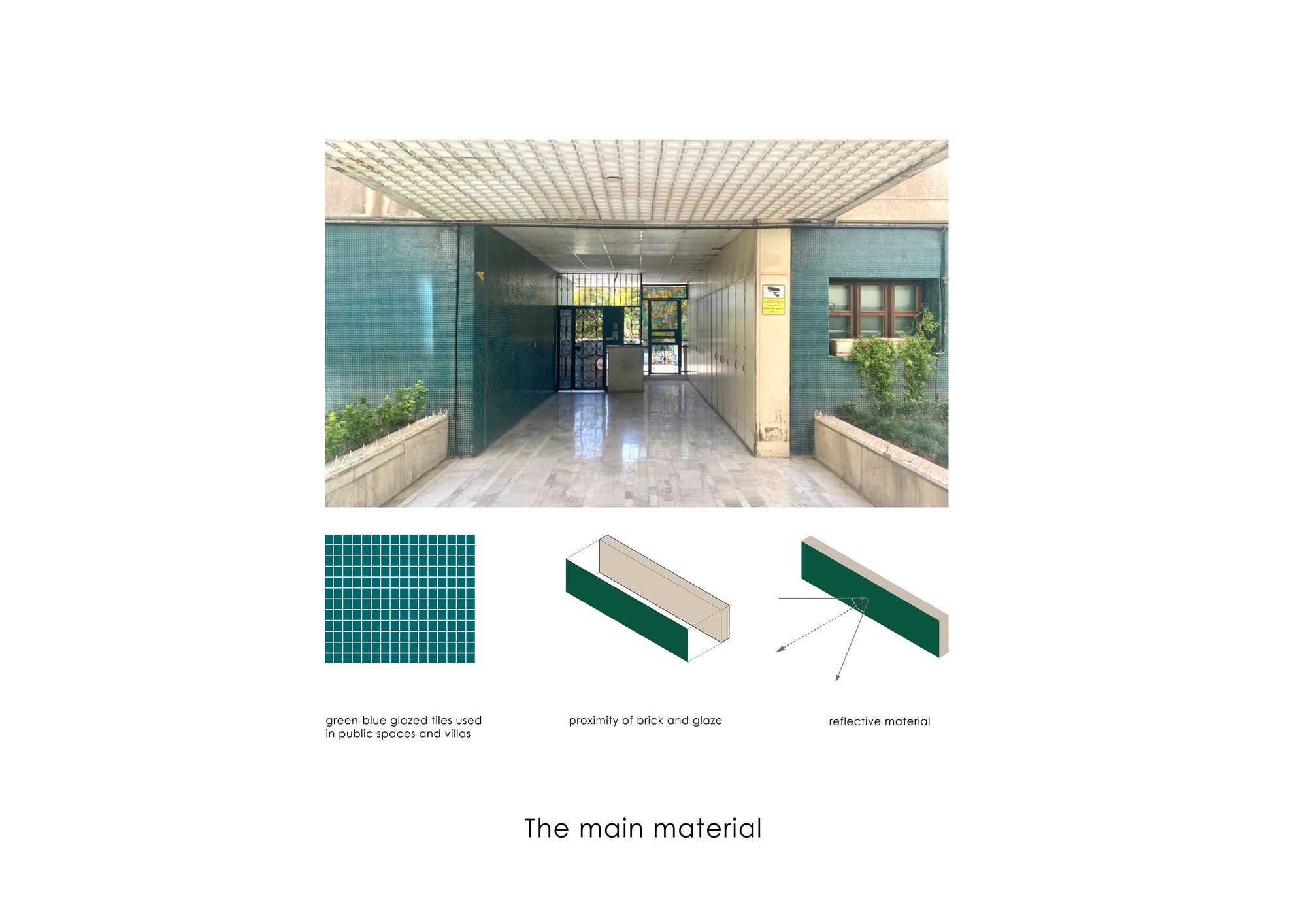 Renovation of Villa Unit 103 in ASP Towers The villa units within ASP Towers are considered one of the few successful architectural models built in Iran, where residents rarely intend to leave and strive to maintain these villas whenever possible. Given the current limitations of Tehran, villa-like qualities are rarely found in urban complexes or within the city’s fabric. ASP Towers, as one of the city’s historic urban spaces, hold a significant place in Tehran’s collective memory. Over time, many villa units within this complex have undergone renovation due to aging. The unique lifestyle offered by these villa units, combined with their diverse amenities, has created an exceptional living experience. Project Statement The project idea originated from the connection between the courtyard (outside) and the house (inside), with a strategy focused on expanding the interaction between the limited courtyard and the lightwell boundary. Consequently, the main question posed was: How can a rigid boundary be transformed into a dynamic and multidimensional space? Additionally, how can the courtyard space be separated from the house while turning the boundary into an intermediate (mediating) space? Mediating Space The intermediate space can play a developmental and mediating role in enhancing the relationship between the interior and exterior, addressing the diminished quality of such spaces. This space acts as a reflective yet abstract representation of the qualities of its adjacent areas. Functionally, the intermediate space serves as a green area, a semi-open zone, and a defining feature for the entryways. It establishes the connection between the outside and inside of the project. By analyzing the existing plan and addressing identified needs, the renovation sought to resolve several weaknesses, including: • Limited interaction between indoor and outdoor spaces. • Insufficient light penetration into deeper areas of the villa. • Lack of privacy for the courtyard space from upper apartments. • Poor cohesion between public, private, and courtyard spaces. The interior spaces were reorganized into three zones: courtyard, intermediate space, and interior. This organization was achieved through the mediating space. The interior design emphasized reflecting the exterior in areas where indoor spaces terminate, using reflective surfaces such as angled mirrors in some sections. In other areas, glass partitions were used to separate and define spaces while maintaining visual continuity. Material Concept The material selection reflects the unique identity of the glazed green-blue tiles characteristic of ASP Towers. These tiles, a distinctive and shared feature of the common areas and villa units, were used as a primary design element. Additionally, efforts were made to enhance the reflective quality of the space by incorporating the green-blue color palette in glazed materials, reinforcing the abstract interaction and merging of interior and exterior spaces.