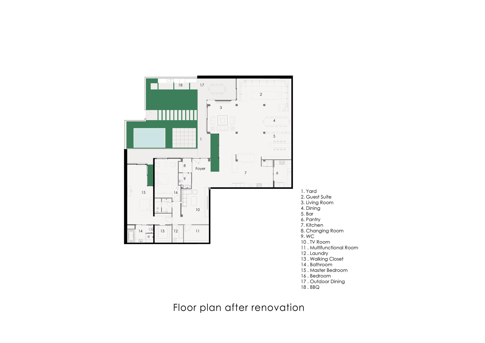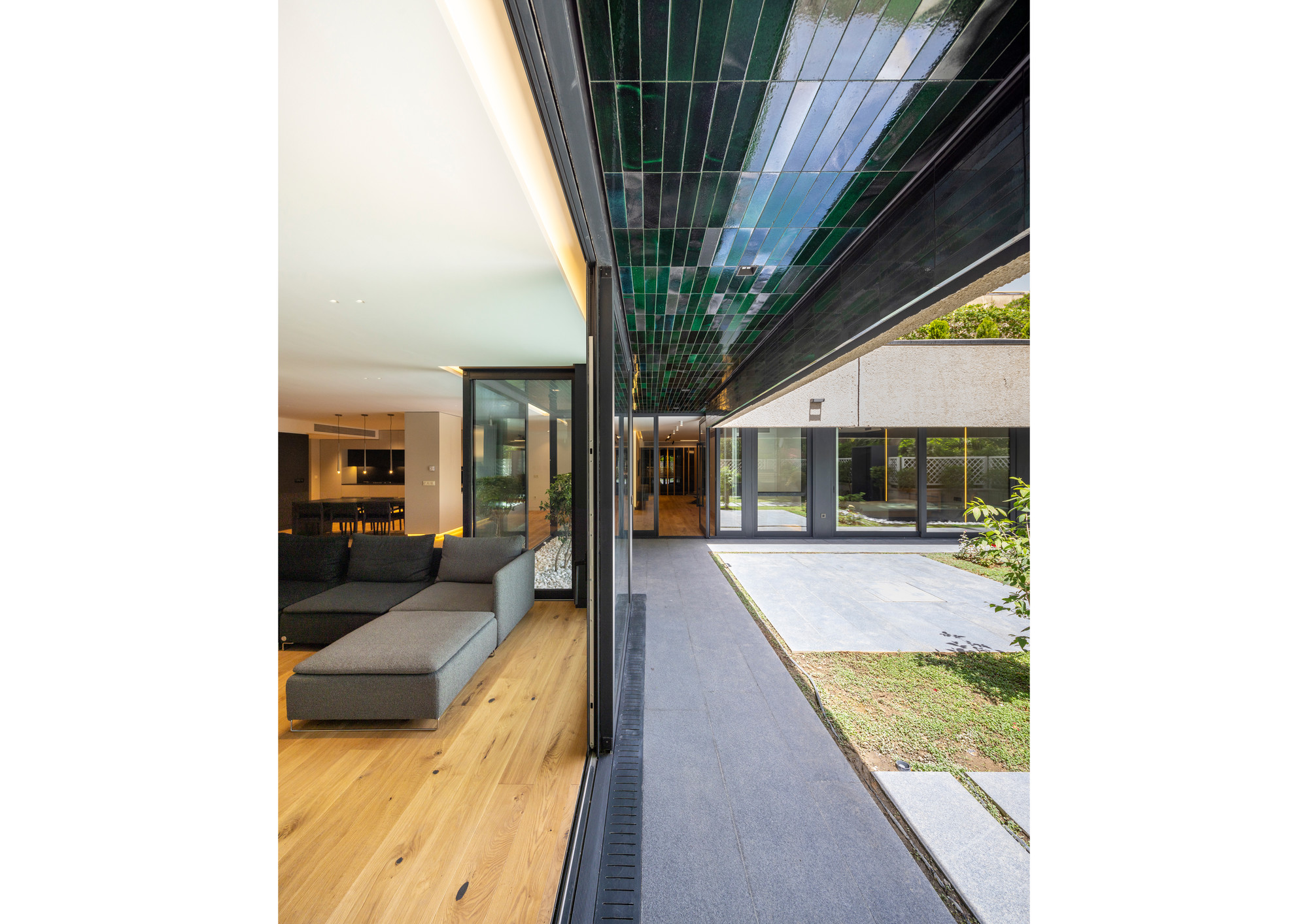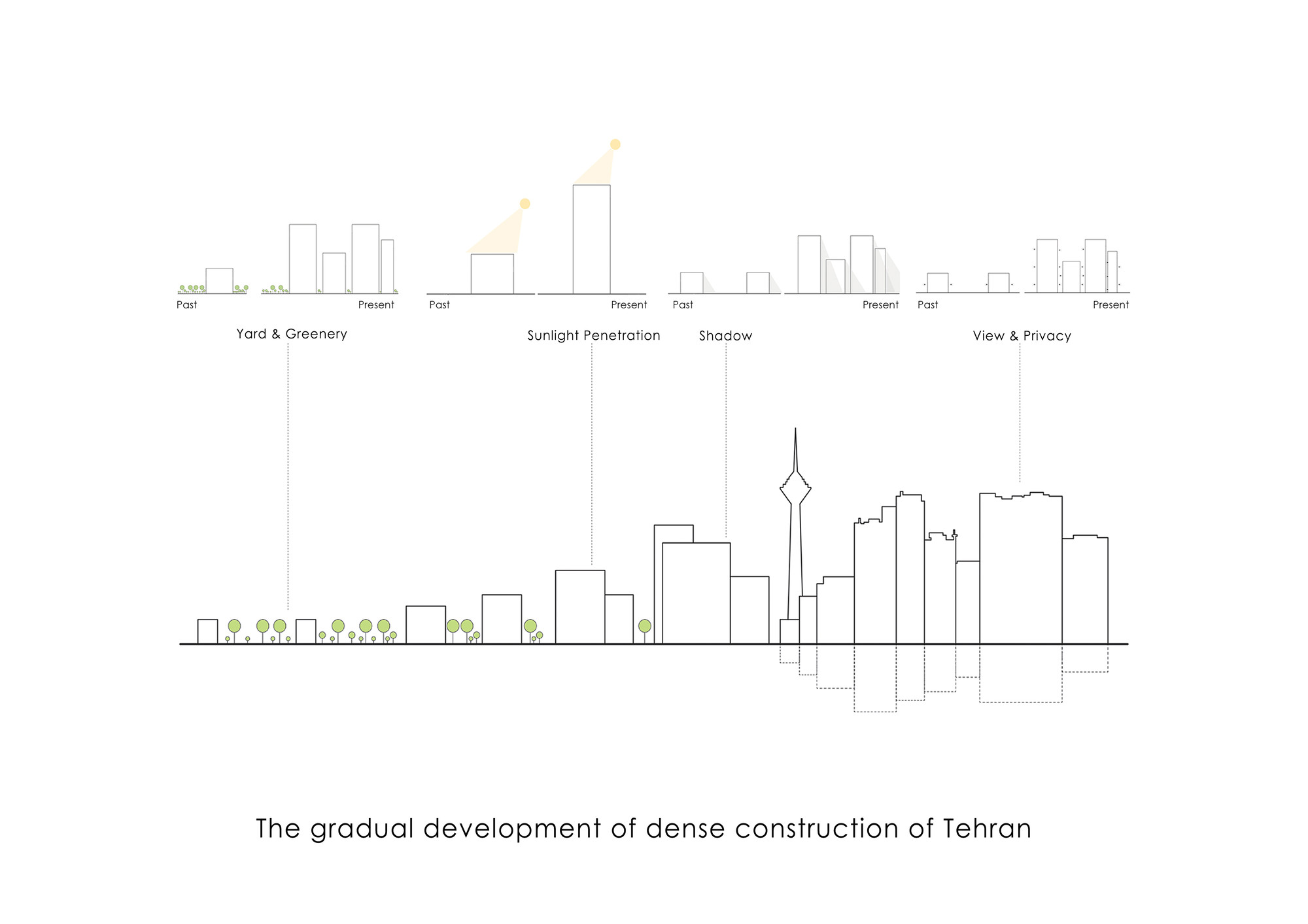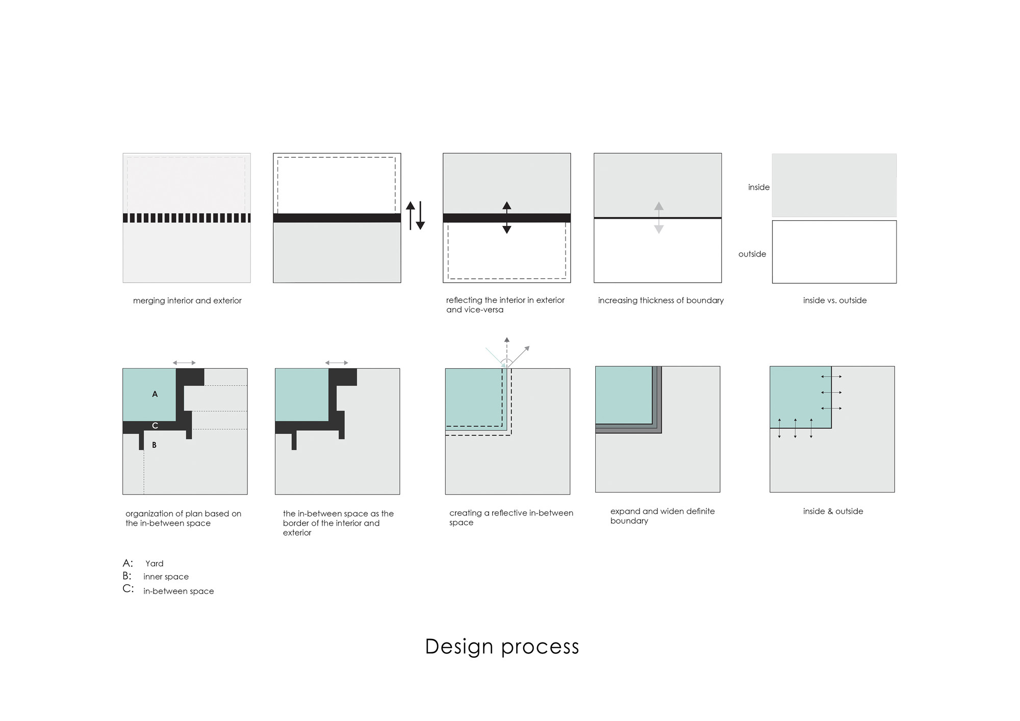 Renovation of Villa Unit 103 in ASP Towers The villa units within ASP Towers are considered one of the few successful architectural models built in Iran, where residents rarely intend to leave and strive to maintain these villas whenever possible. Given the current limitations of Tehran, villa-like qualities are rarely found in urban complexes or within the city’s fabric. ASP Towers, as one of the city’s historic urban spaces, hold a significant place in Tehran’s collective memory. Over time, many villa units within this complex have undergone renovation due to aging. The unique lifestyle offered by these villa units, combined with their diverse amenities, has created an exceptional living experience. Project Statement The project idea originated from the connection between the courtyard (outside) and the house (inside), with a strategy focused on expanding the interaction between the limited courtyard and the lightwell boundary. Consequently, the main question posed was: How can a rigid boundary be transformed into a dynamic and multidimensional space? Additionally, how can the courtyard space be separated from the house while turning the boundary into an intermediate (mediating) space? Mediating Space The intermediate space can play a developmental and mediating role in enhancing the relationship between the interior and exterior, addressing the diminished quality of such spaces. This space acts as a reflective yet abstract representation of the qualities of its adjacent areas. Functionally, the intermediate space serves as a green area, a semi-open zone, and a defining feature for the entryways. It establishes the connection between the outside and inside of the project. By analyzing the existing plan and addressing identified needs, the renovation sought to resolve several weaknesses, including: • Limited interaction between indoor and outdoor spaces. • Insufficient light penetration into deeper areas of the villa. • Lack of privacy for the courtyard space from upper apartments. • Poor cohesion between public, private, and courtyard spaces. The interior spaces were reorganized into three zones: courtyard, intermediate space, and interior. This organization was achieved through the mediating space. The interior design emphasized reflecting the exterior in areas where indoor spaces terminate, using reflective surfaces such as angled mirrors in some sections. In other areas, glass partitions were used to separate and define spaces while maintaining visual continuity. Material Concept The material selection reflects the unique identity of the glazed green-blue tiles characteristic of ASP Towers. These tiles, a distinctive and shared feature of the common areas and villa units, were used as a primary design element. Additionally, efforts were made to enhance the reflective quality of the space by incorporating the green-blue color palette in glazed materials, reinforcing the abstract interaction and merging of interior and exterior spaces.