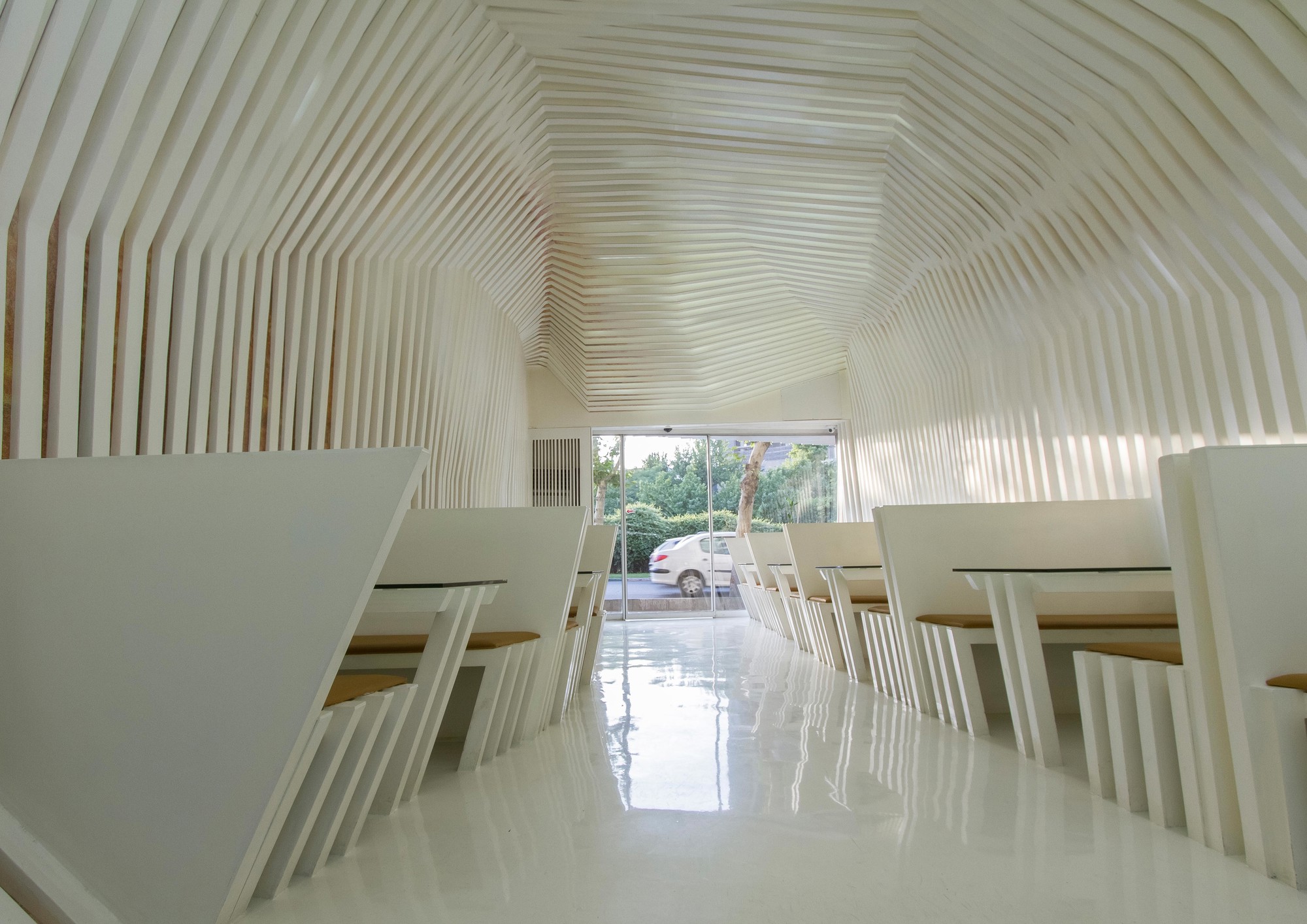The aim of this project was to retrofit an old electric shop into a new restaurant. In an attempt to establish a new definition of the interior and the exterior elements, all the typical elements commonly used in a restaurant space were eliminated in the design process. The main design criterion was to create an integrated system starting from the exterior façade and extending to the interior space to form not only the architectural surfaces (façade, walls, ceiling, etc.), but also all the fundamental interior elements of the restaurant such as, tables, chairs, decorations, electrical and mechanical equipment, as well as lighting. Another important design consideration was to create a variety of aesthetic experiences by modifying lights, colors, and spatial qualities inside and outside the restaurant.