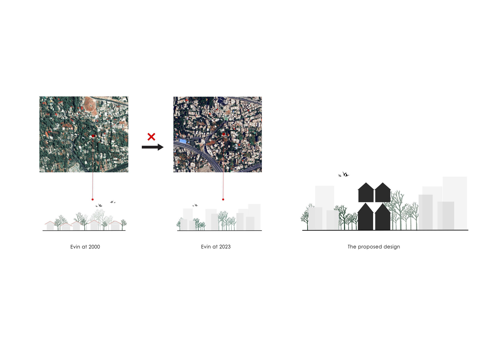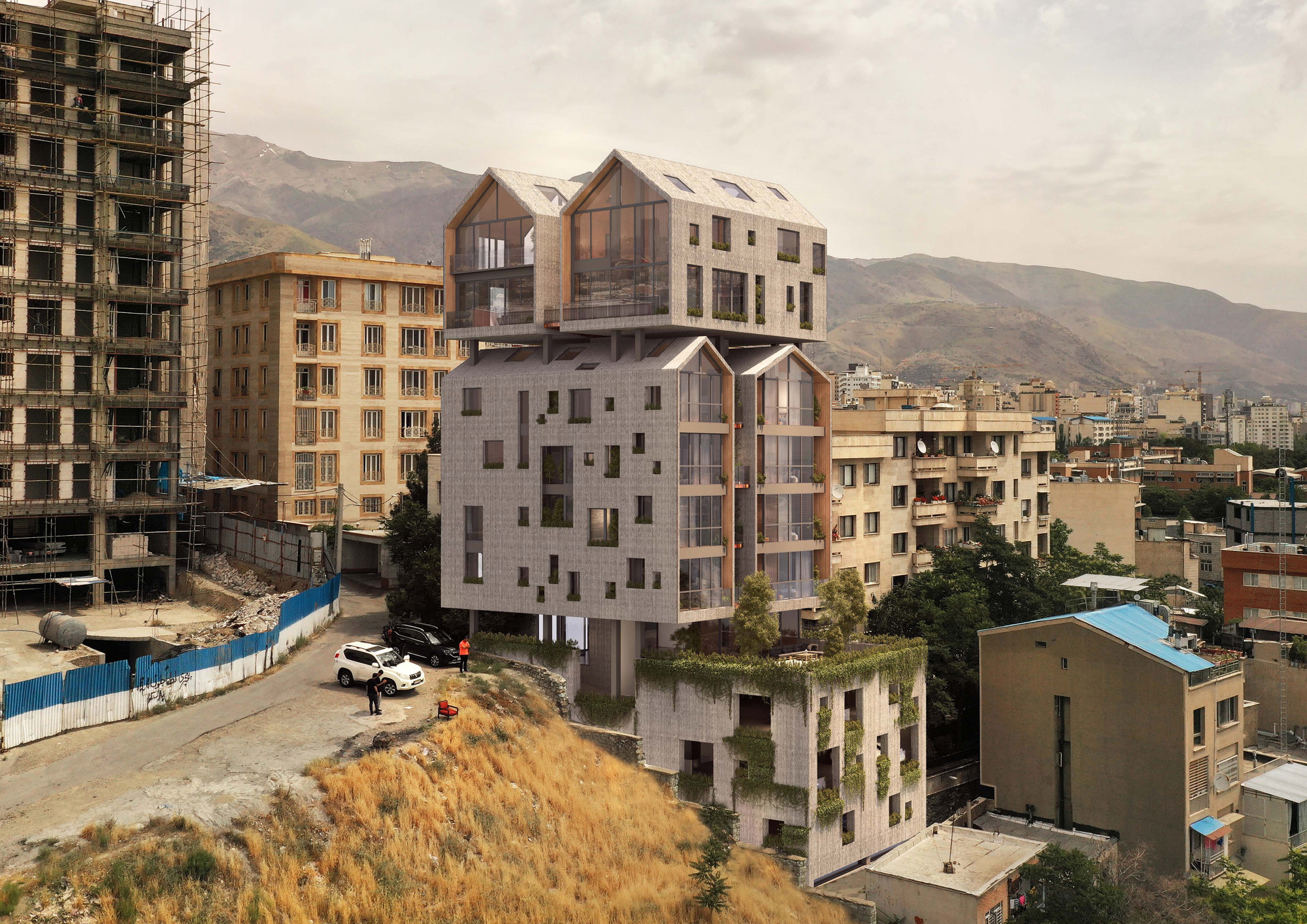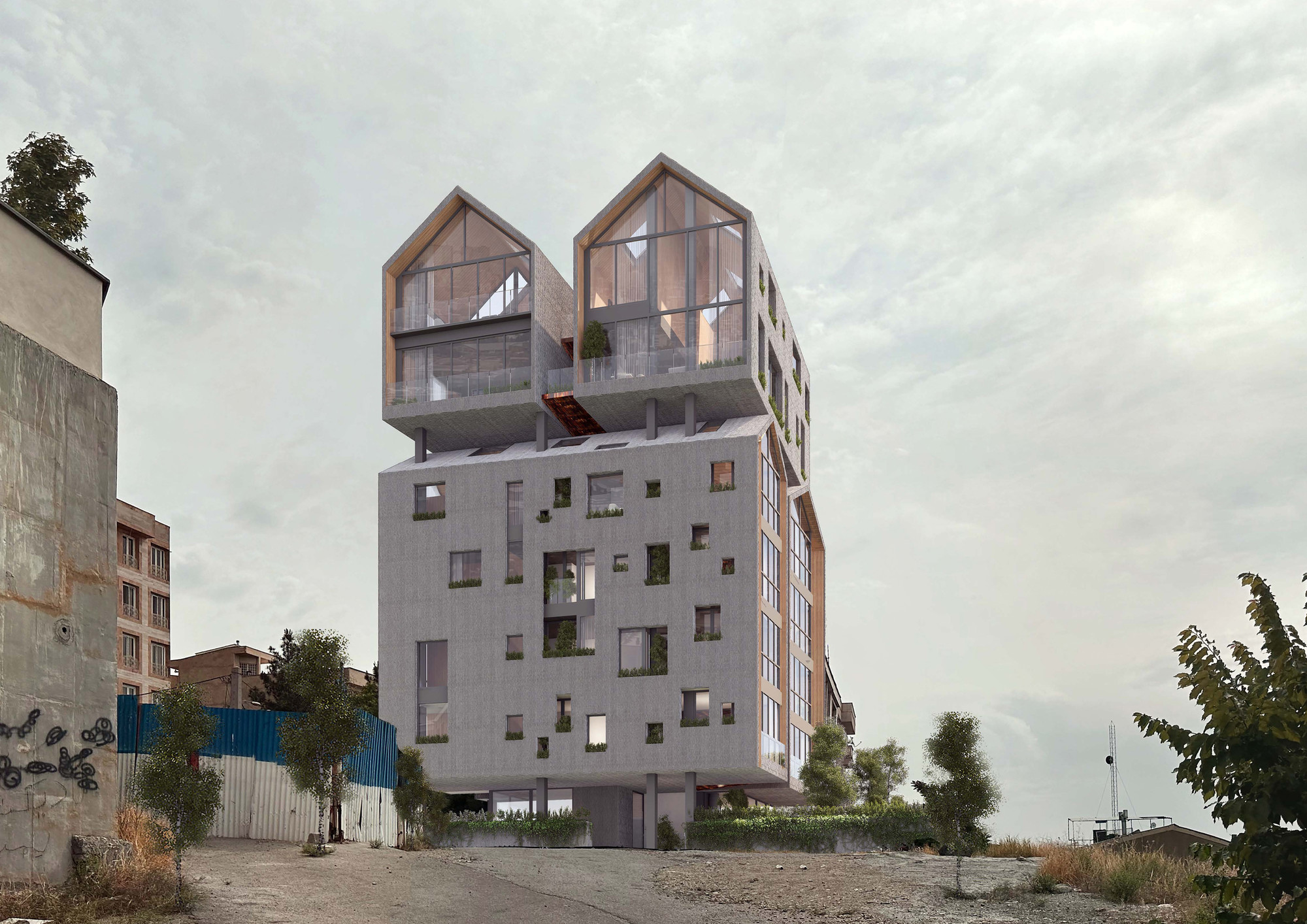 The Evin area in northern Tehran was traditionally known for its villa projects. However, in recent years, the landscape has changed from villas to mid-scale apartments, and now to high-rise apartments. It's important to define the architectural quality of these new buildings and establish a suitable pattern for the area that benefits investors. The apartment design is based on the concept of mimicking a villa apartment from the initial proposed plan, complete with a yard of about ten square meters. The units are separated by semi-open spaces and half-play yards instead of common walls. These semi-open spaces serve as entrance courtyards connected to the living space, and are reflected in the design plans. The external volume of the project is structured with two units on four floors, and two separate volume masses for the duplex units on the fifth and sixth floors. The design prioritizes the integration of green space and openings in the majority of the outer wall's thickness, rather than focusing on the composition of balconies or windows. Emphasis is placed on the volumetric mass and the spaces between them, taking into account the scale of the project. The lower levels of the building, especially below ground, are designed to control light and security while also creating green spaces for service areas. Another defining feature of the building design is the use of sloping roofs, which allows natural light to enter the building and gives a unique quality to the units. This design choice also focuses on using a minimal color palette for the exterior walls and highlighting the building's green features. To achieve this, the vertical grooved stone material is used for the units, while copper enamel materials are used in between them. It's important to emphasize the volumetric grooves in the project.