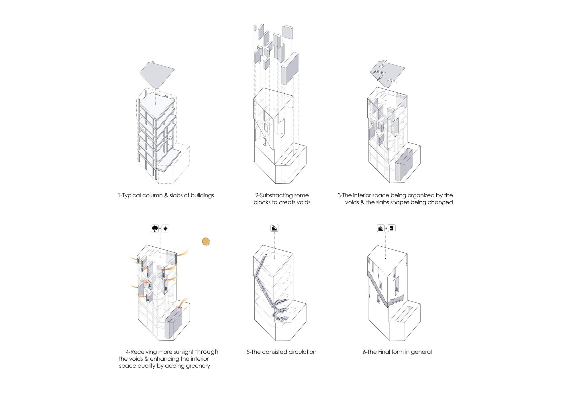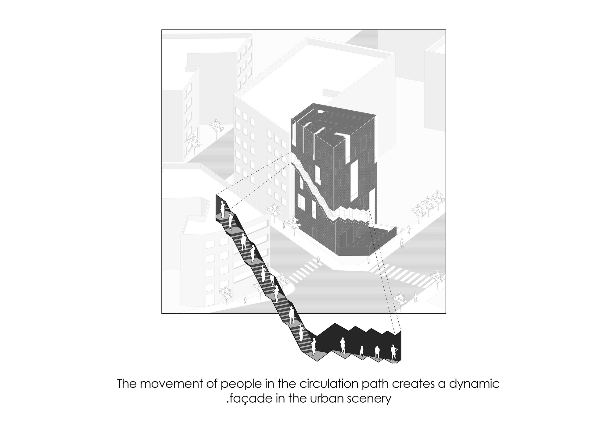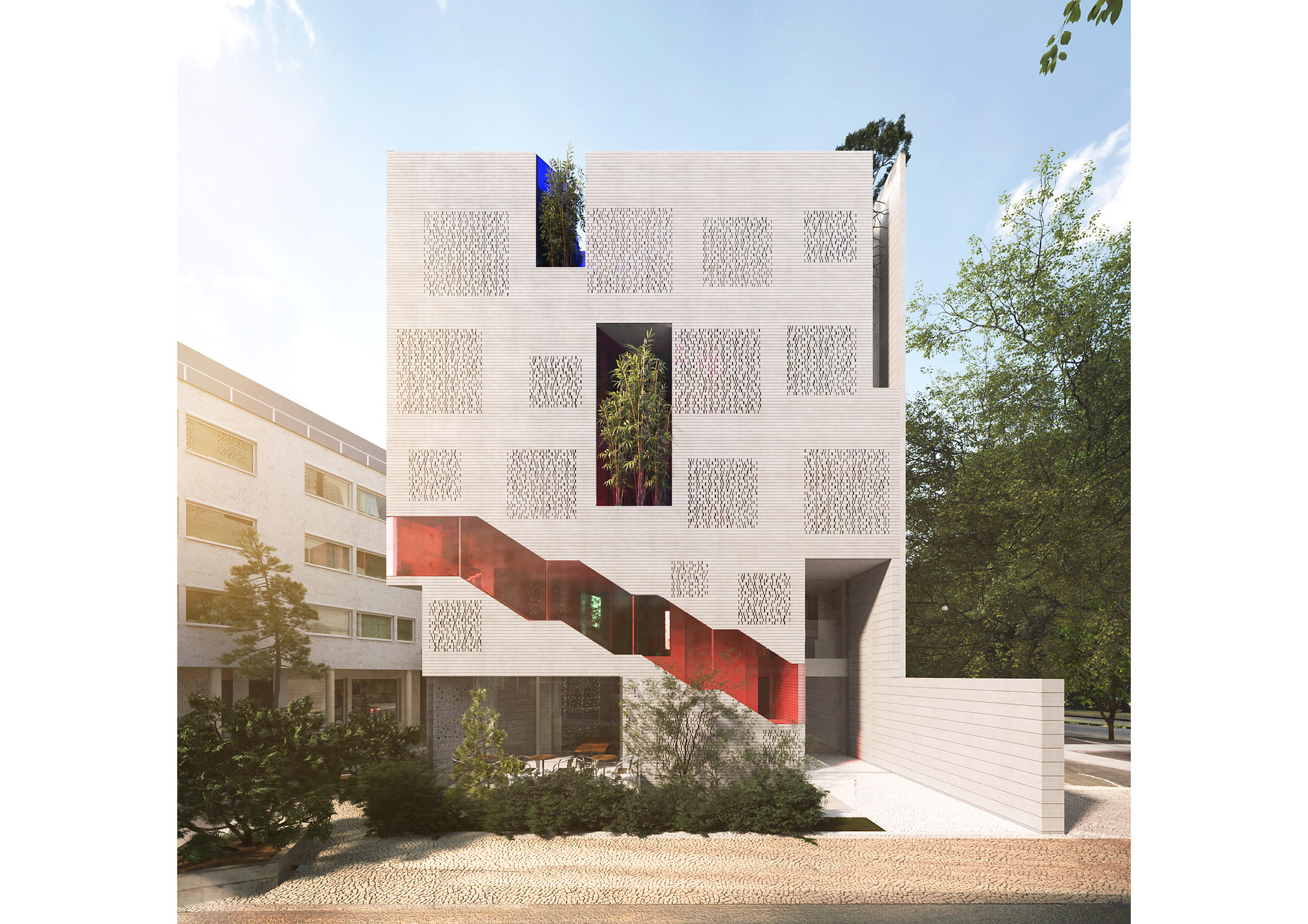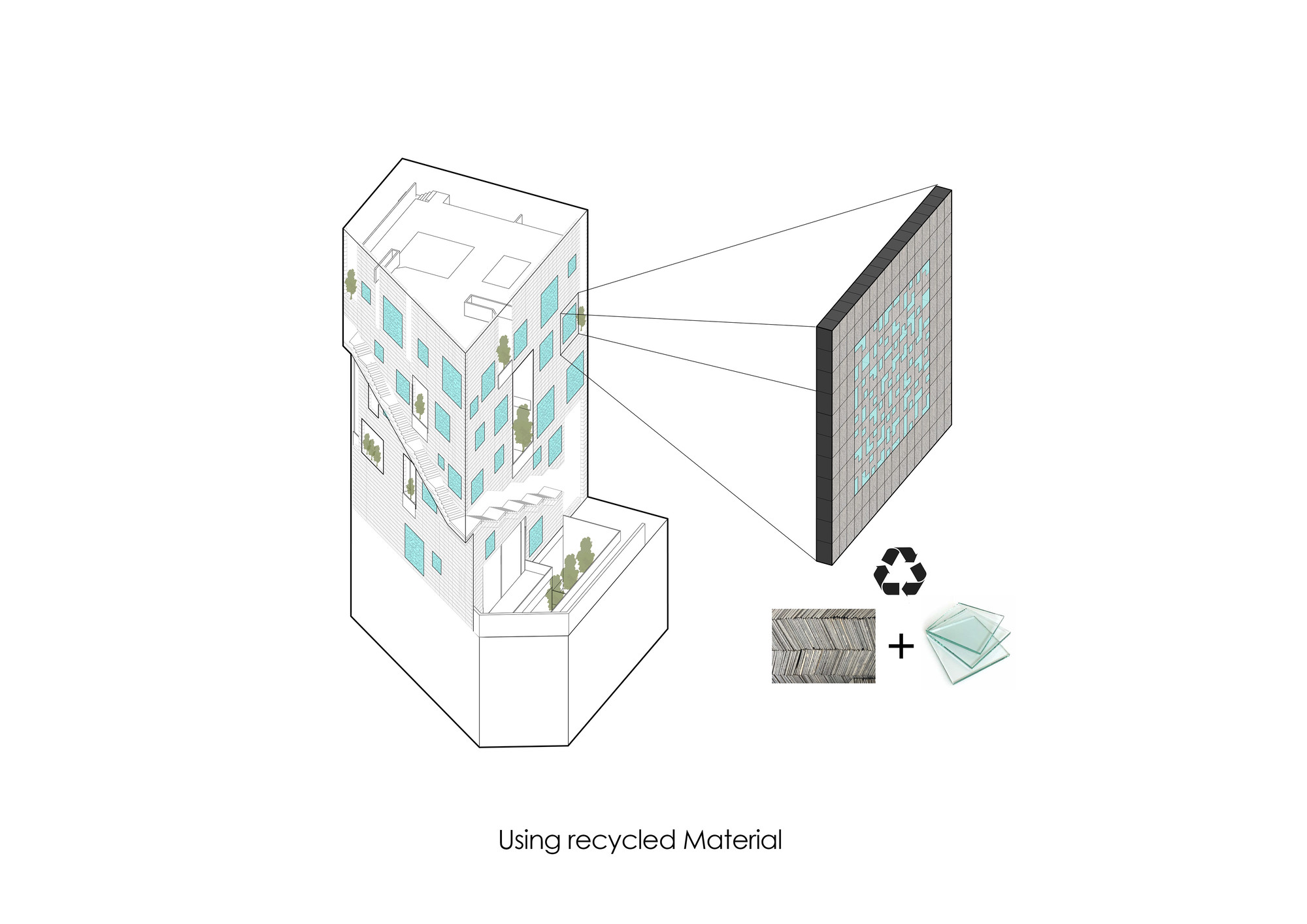 Karaj Physiotherapy Clinique is located in the developing part of Karaj city, in a neighborhood where a lot of the residential fabric is being replaced by office and commercial projects. the program of the project was to create a physiotherapy Clinique and related services in different floors of a small piece of land. A semi-transparent façade was designed which extends to the interior spaces, creating voids and greenspaces. The material palette of the project consists of recycled glass and stones from the cut stones of the factories, to form a semi-transparent façade. Recycled plastic bottles were used in the procedure of connecting the pieces of glasses together. The plastic bottles were heated to connect the glass pieces together. Making use of these recycled materials, the façade of the project is now semi-transparent, allowing optimum sun light exposure, while minimizing overlook to the interior spaces Considering the small scale of the land, a vertical core was not feasible to consider. Therefore, it was decided to create a homogenous circulation path on the façade of the building in the form of a transparent staircase. This technique allowed for more usable interior spaces inside the building. Moreover, the movement of people in the circulation path creates a dynamic façade in the urban scenery. A void was created to the underground level outside the main entrance of the building which not only provides sunlight to the underground level, but also creates boundary and separation between the building and the urban site. This void includes greenspaces which are then replicated on the façade.