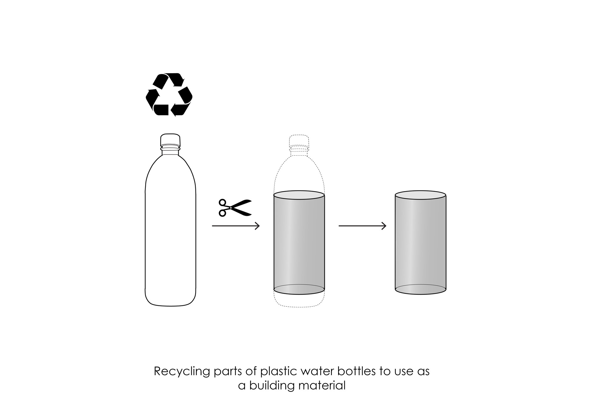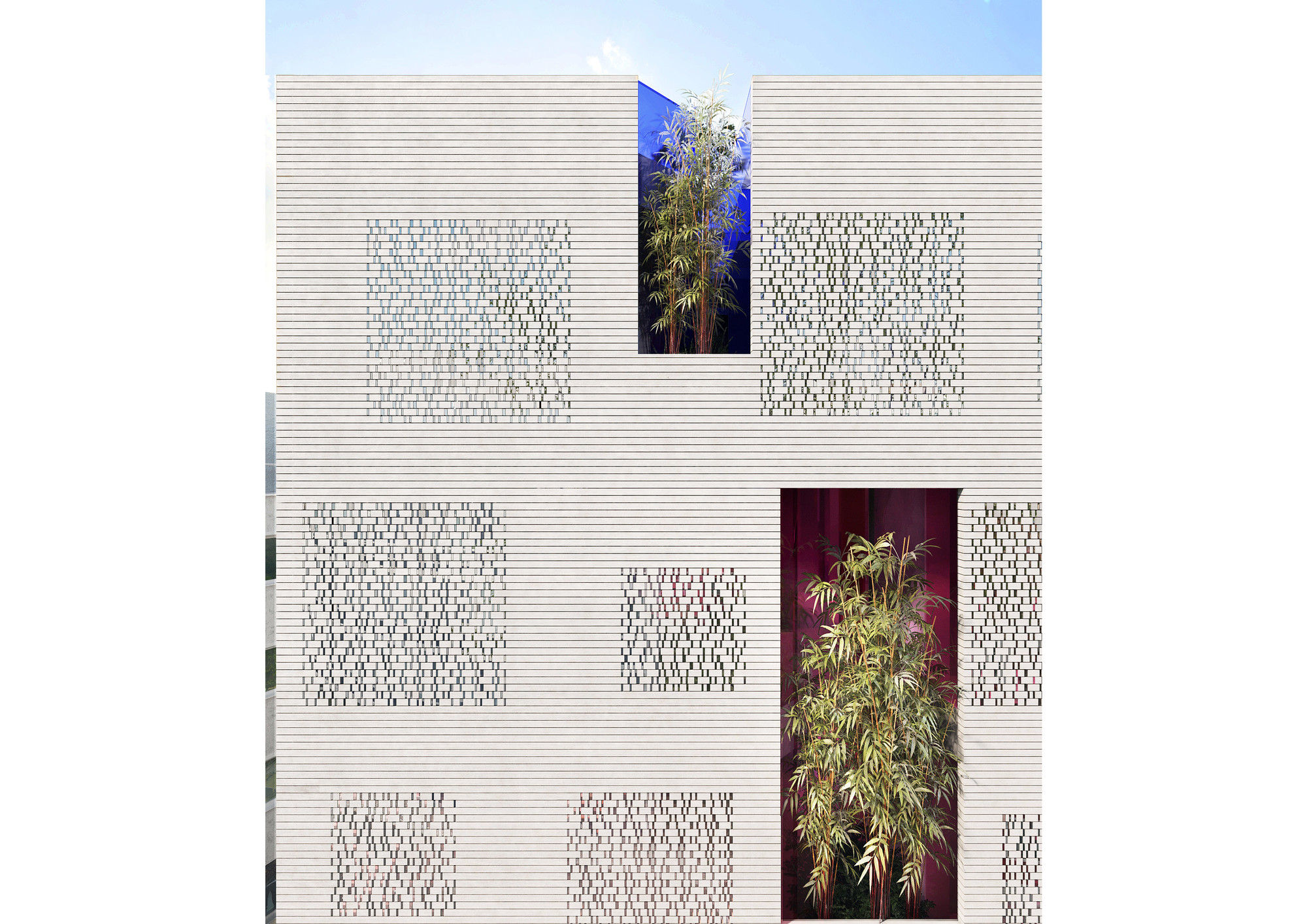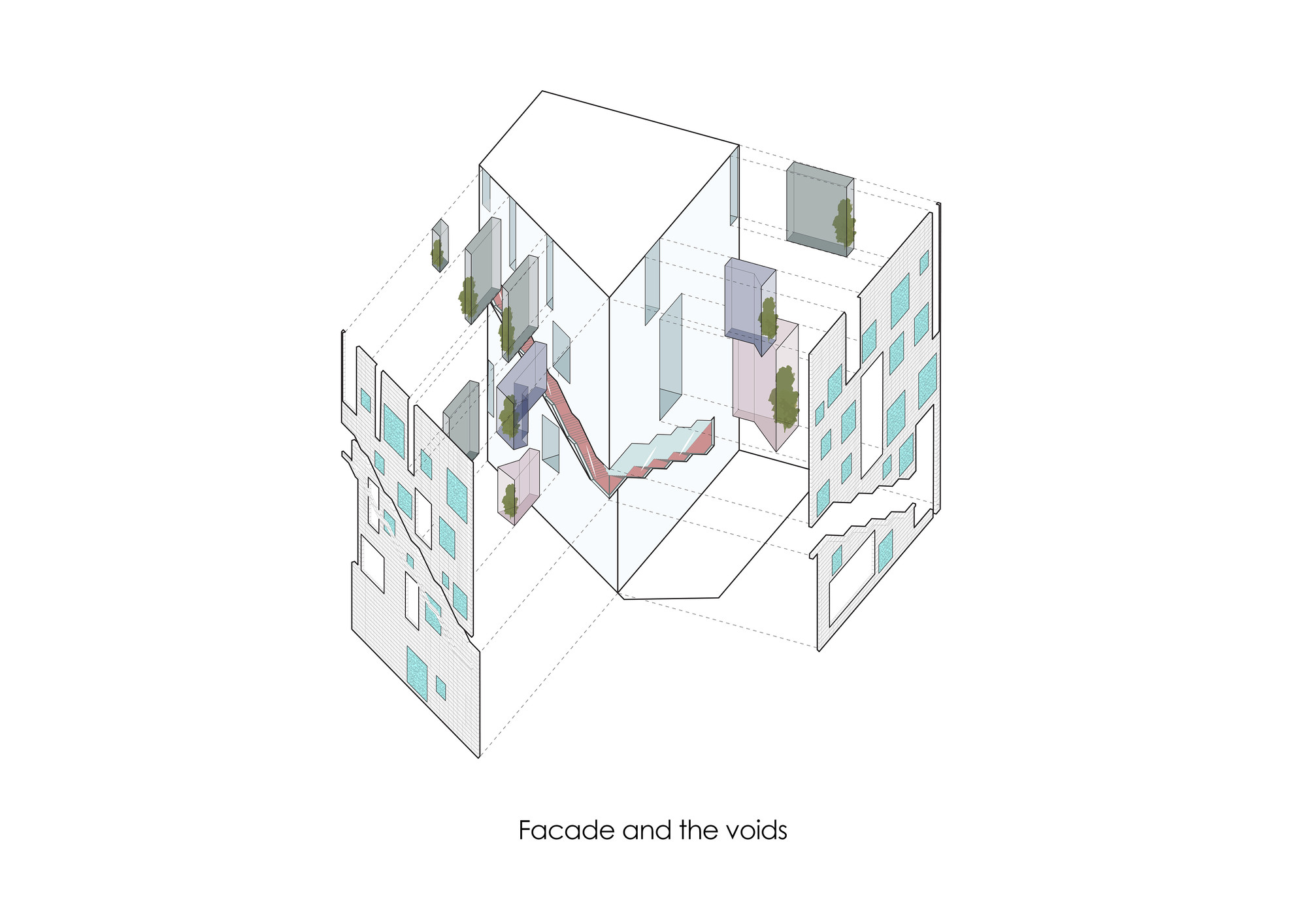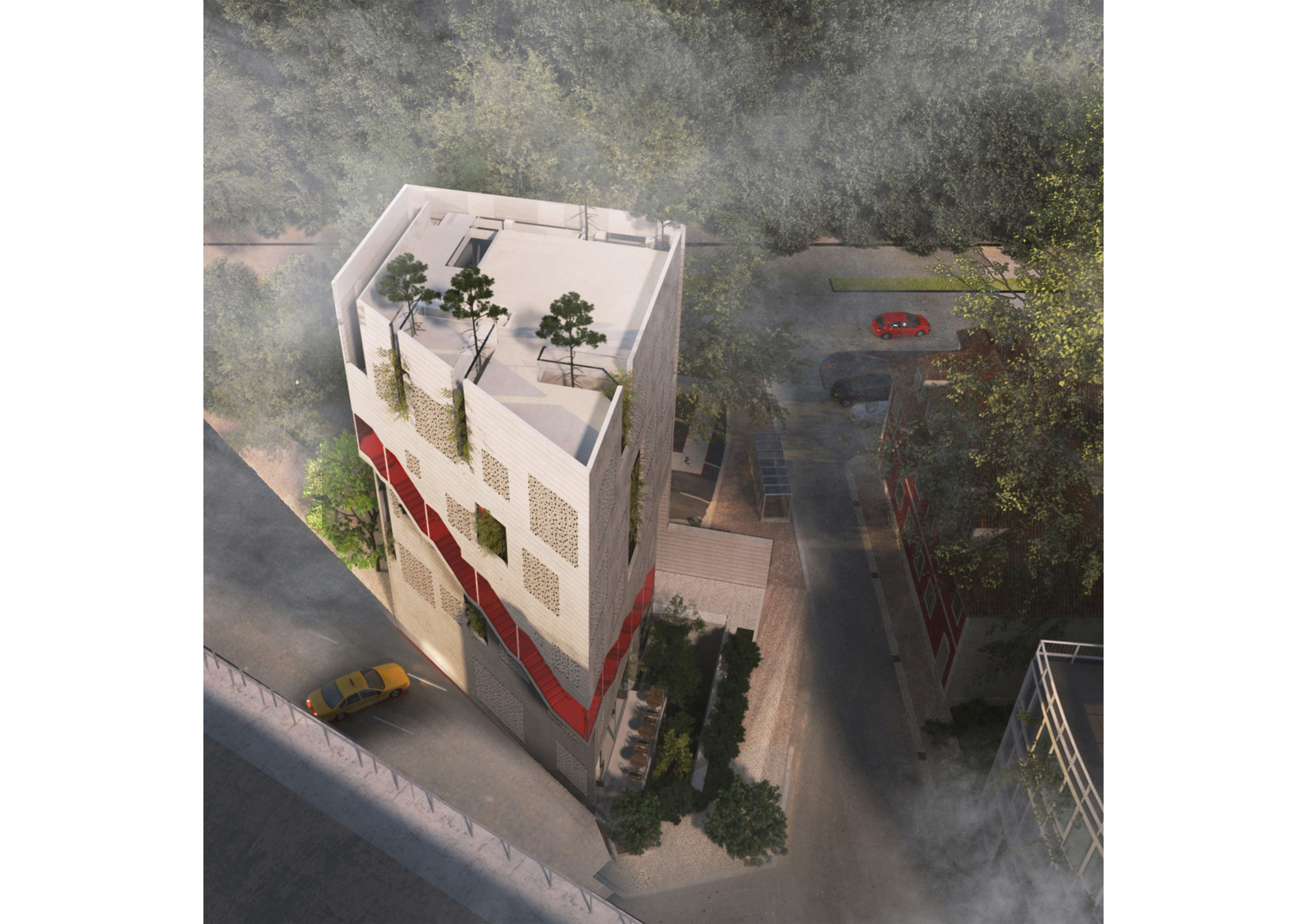 Karaj Physiotherapy Clinique is located in the developing part of Karaj city, in a neighborhood where a lot of the residential fabric is being replaced by office and commercial projects. the program of the project was to create a physiotherapy Clinique and related services in different floors of a small piece of land. A semi-transparent façade was designed which extends to the interior spaces, creating voids and greenspaces. The material palette of the project consists of recycled glass and stones from the cut stones of the factories, to form a semi-transparent façade. Recycled plastic bottles were used in the procedure of connecting the pieces of glasses together. The plastic bottles were heated to connect the glass pieces together. Making use of these recycled materials, the façade of the project is now semi-transparent, allowing optimum sun light exposure, while minimizing overlook to the interior spaces Considering the small scale of the land, a vertical core was not feasible to consider. Therefore, it was decided to create a homogenous circulation path on the façade of the building in the form of a transparent staircase. This technique allowed for more usable interior spaces inside the building. Moreover, the movement of people in the circulation path creates a dynamic façade in the urban scenery. A void was created to the underground level outside the main entrance of the building which not only provides sunlight to the underground level, but also creates boundary and separation between the building and the urban site. This void includes greenspaces which are then replicated on the façade.